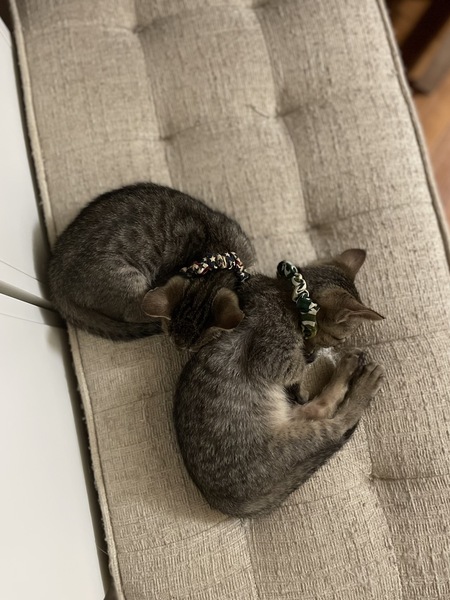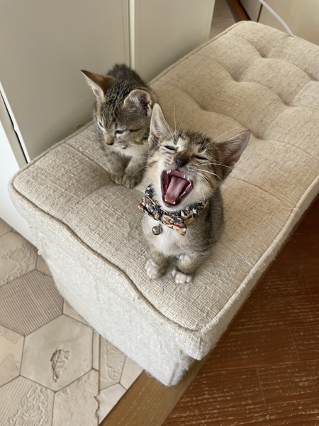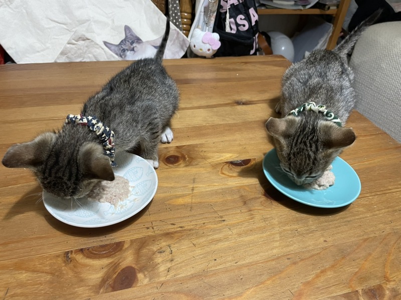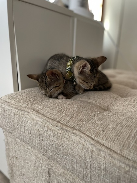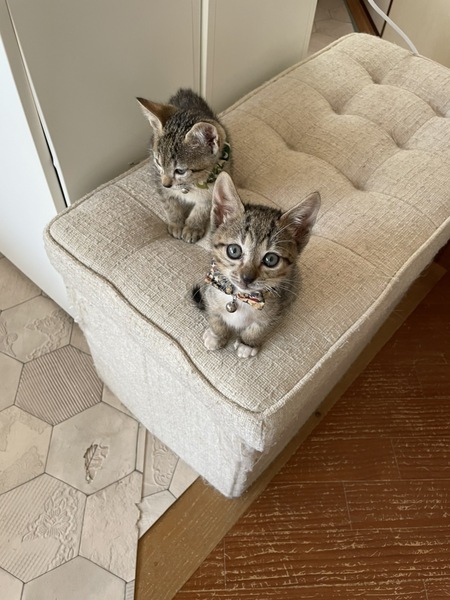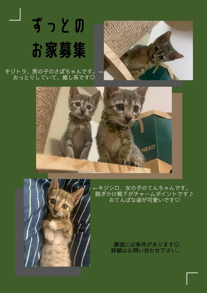 | 特徴(性格など) | きじとら【さぼ】→オス きじしろ【てん】→メス 兄妹仲良しで子猫らしく元気いっぱいに戯れ合ってます。 猫にも人にも懐っこく とても愛らしい兄妹です(*˘︶˘*).。.:*♡ |