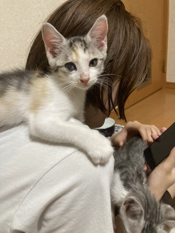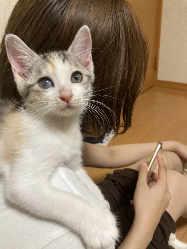 | 特徴(性格など) | 三毛 甘えん坊❣️ 飼い主の肩や背中に乗るのが大好き❤ 他の子たちとも仲良くしてます 保護時、目が目ヤニで開かない状態で治療して完治したが、片目が白濁しています 見た目にはほとんど分かりません 今後、治療の必要なし |
