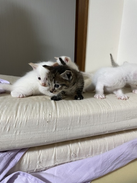 | 特徴(性格など) | 父猫スコテイッシュのMIX 母猫メインクーン 白(ブルーアイ)全てオス 黒はメス 子猫らしく好奇心旺盛です。 |