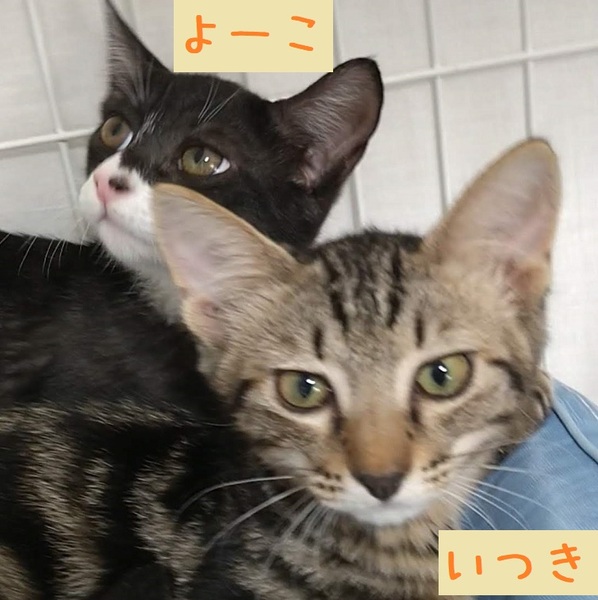 | 特徴(性格など) | 【よーこ】…ブラックスモークホワイト 薄い黒で縞模様の入ったオシャレな柄 遊ぶ時は子猫らしくお転婆だけど、普段は穏やかでナデナデも一番最初に許してくれて、せがむようになった甘えっ子^^ 抱っこも大丈夫。 【いつき】ブラウンタビー アメショー風の柄がこれまたオシャレ。 怖がりだったけど、今ではケージに近づくと一番に寄ってきてアピールするようになりました♪ 遊ぶのも大好き!! |