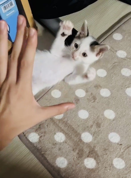 | 特徴(性格など) | 大体が白でしっぽとあたまと背中に縞々模様があります。 すごく活発なで、人に慣れていてすりすりゴロゴロします。手でパーをすると、子猫ちゃんもパーをしたりします。疲れるとどんな格好でも寝ています。 |