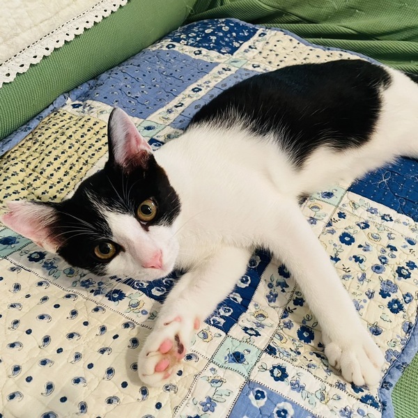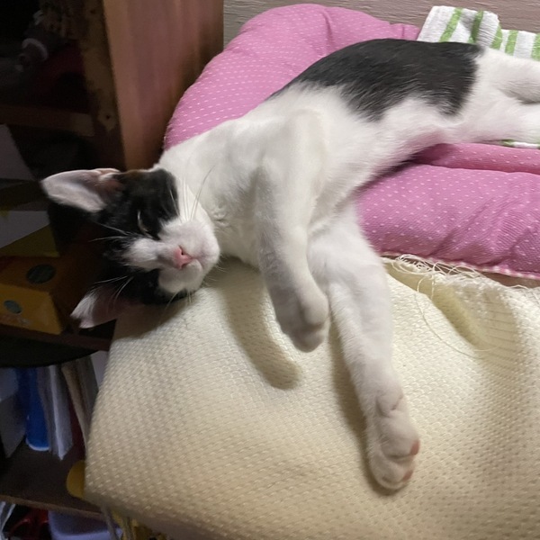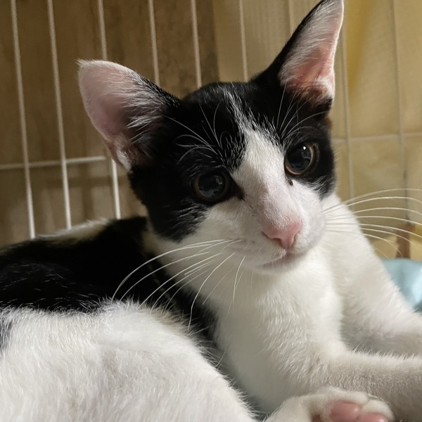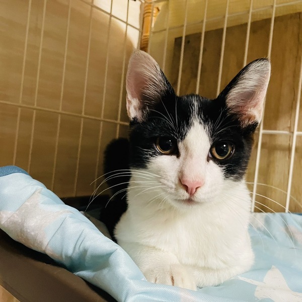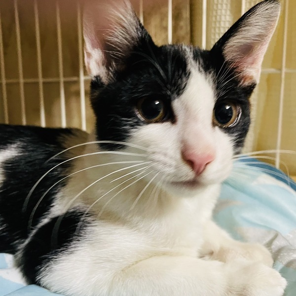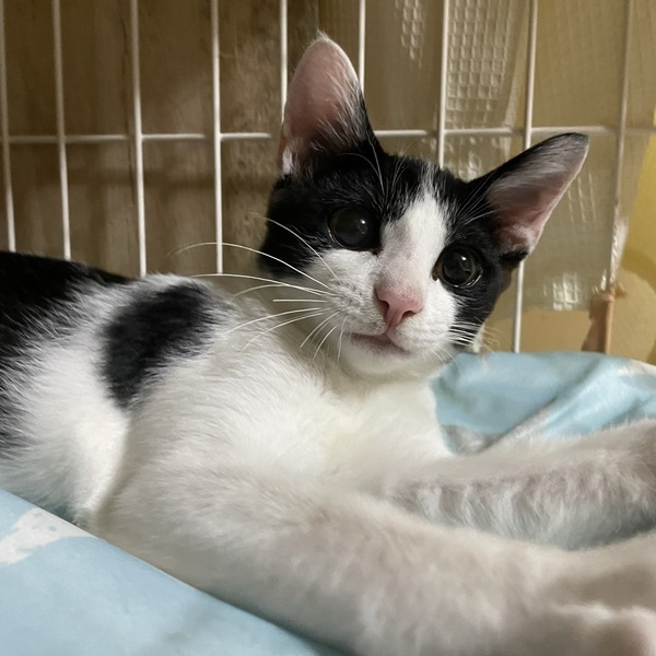 | 特徴(性格など) | 白黒カラーのハチワレ猫。オス。 鼻はピンク、肉球はピンクに少し黒のポイント、尻尾は真っ直ぐで真っ黒、瞳はイエロー系。 右耳に去勢済みのカットが入りサクラ耳になっています。 性格は活発なほうだと思います。 人馴れはしていて、抱っこもでき、とても甘えん坊。ゴロゴロスリスリ。 保護直後隔離期間中はケージ生活でしたから、寂しがりやのようでケージインの間はかなり激しく鳴きました。ケージから出して抱っこするとピタっと鳴きやみ甘えます。隔離終了後もすぐにリラックスして環境に慣れ、ソファーで寛いでいます。 譲渡後の夜鳴きがあった場合は少し声が激しめが予想されますので、戸建てか防音のしっかりされたお家が望ましいです。 早めにケージフリーで大丈夫なタイプだとは思います。預かりでは馴染みも早く、子猫らしく無邪気に遊び、お腹を出して寝ています。 猫も好きなようで先住さんがいてるお家歓迎なのですが、積極的なほうなので先住さんの性格を考慮お願いします。 |
