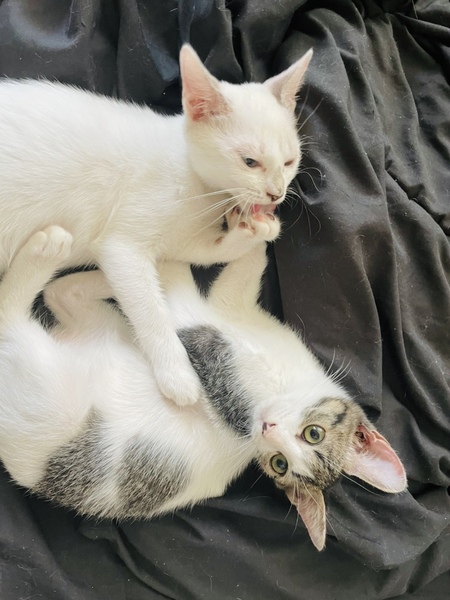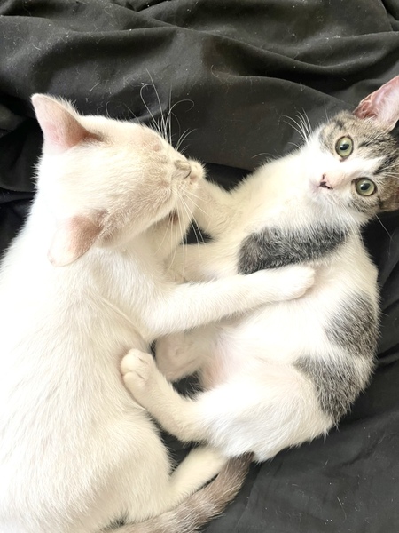 | 特徴(性格など) | シャムミックスと、サバ白の兄弟です 2匹ともベタベタの甘えん坊さん サバ白くんは、慣れるのに数日かかるかもしれません 先住猫とも仲良くできています 元気いっぱい! 2匹で遊んでいます ◆健康状態 体重 1.6キロ ノミ・ダニ・寄生虫 駆虫済み 便の検査 異常なし ワクチン 1回目済み ウィルス検査 陰性 近く、去勢手術の予定です |