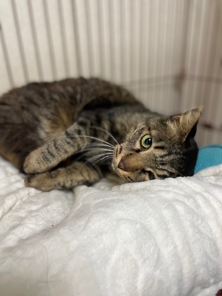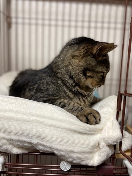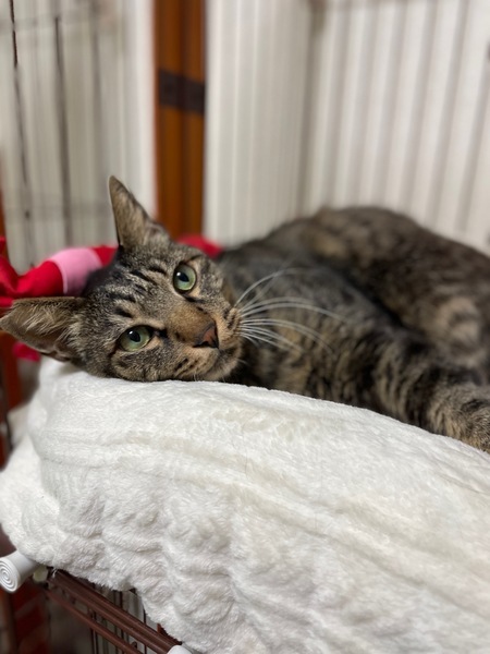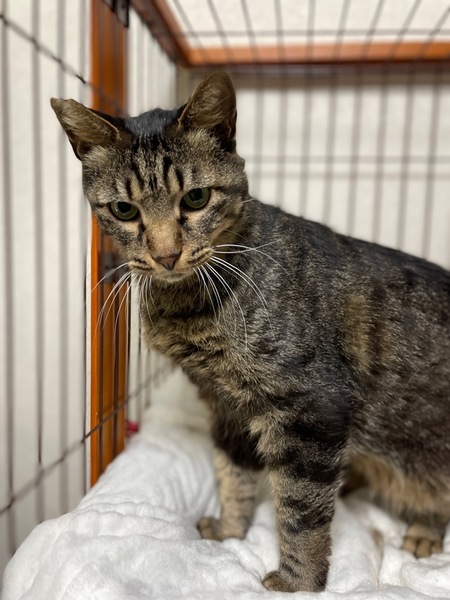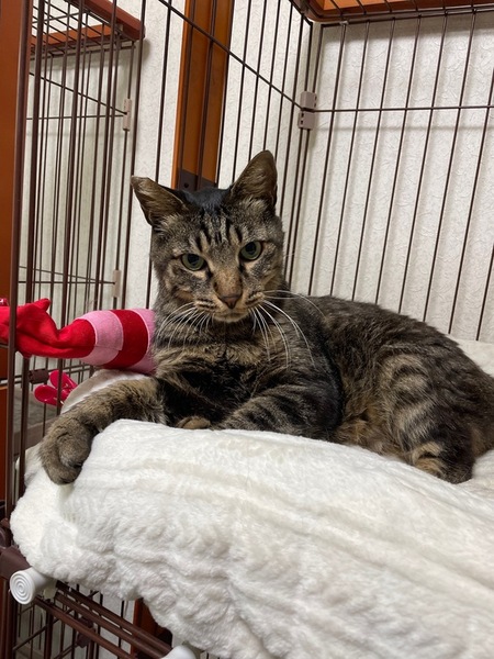 | 特徴(性格など) | キジトラ柄の男の子で首回りが半長毛です 年齢は1歳半~2歳くらいで体重は保護時4.7kgでした 毛がフワフワで柔らかく、尻尾は長めで真っすぐです 性格は甘えん坊で人馴れしています 自分から頭をグイグイ突き出してきて撫でてアピールしてきます 顔を近づけると自分の顔をくっつけてくるような可愛い子です お尻トントンとブラシが大好きな子です フードはドライ、ウェット何でも食べてくれてトイレも問題ありません |