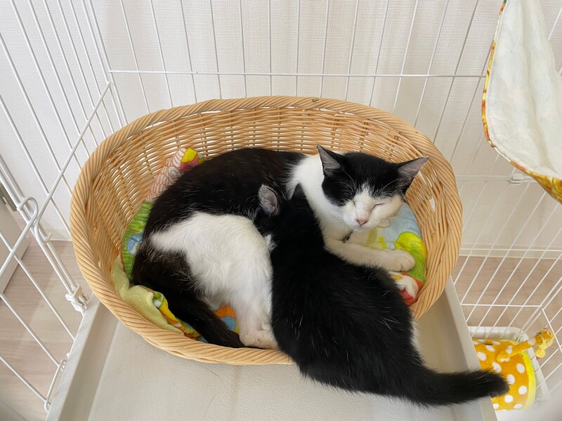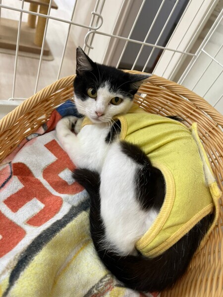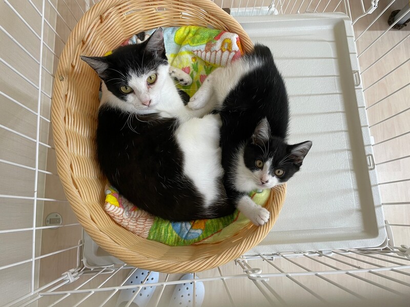 | 特徴(性格など) | ●白&黒 ●ママは「トゥ」推定年齢1~2才、子猫は「ギャザー」でオス、推定年齢2か月です。 ●性格その他:保護当初は警戒心が強くシャーシャーしていましたが、撫でさせてくれるようになりました。親子一緒にもらってくれるお家を希望しています。 |