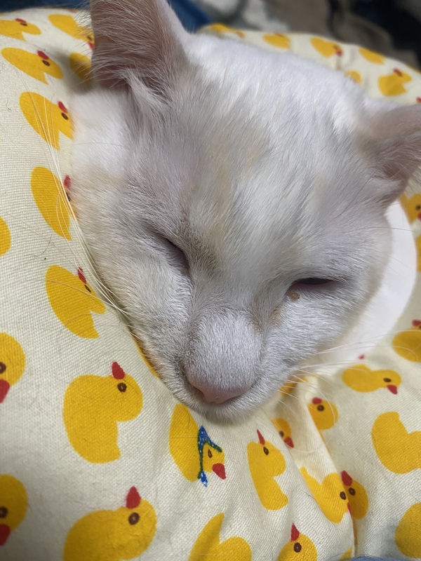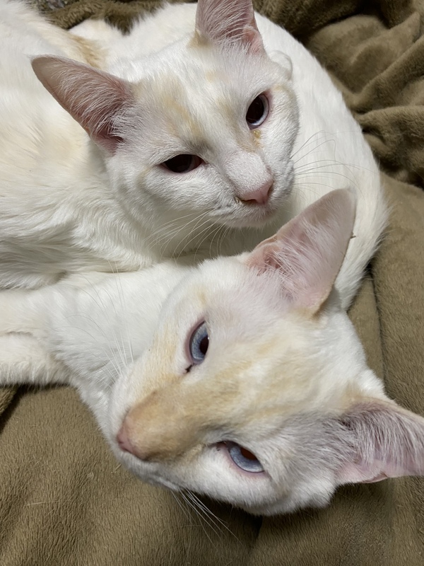 | 特徴(性格など) | 薄い青い目をしており、白地にややオレンジの模様があります。 性格はやや臆病気味ですが、撫でてもらうのが大好きで夜は必ず人と一緒に寝たがります。 いつもさりげなくそばにいたがる隠れ甘えん坊です。 |