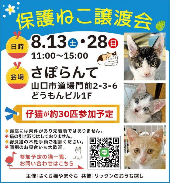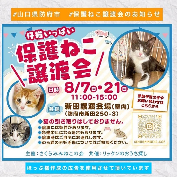 | その他(譲渡条件など) | 【猫の里親を希望される方は、以下の譲渡条件のご確認をお願いいたします】 ●終生、責任と愛情を持って、大事な家族として育てて頂けるようお願いします。 ●一戸建て住宅またはペット可物件にて、完全室内飼育でお願いします。 ●猫を迎えることにご家族全員の承諾をお願いします。 ●お引き取り後はワクチン、ノミダニ駆除、避妊など、定期的に医療ケアをお願いします。 ●譲渡後も無理のない範囲でかまいませんので、成長の様子をご連絡頂きますようお願いします。 ●引き渡しの際に身分証明などを提示し、誓約書への署名をお願いします。 ●トライアルはご自宅にお連れしますので、往復の交通費のご負担をお願いします。 ●高齢者・単身者世帯の方は、60歳以下の後見人が必要となりますので、先に後見人さんの了解を得てからのご応募をお願いします。 ●初めて猫を飼う方は、ご家族に猫アレルギーがないかご確認ください。 |