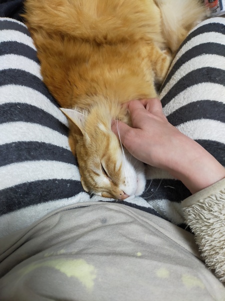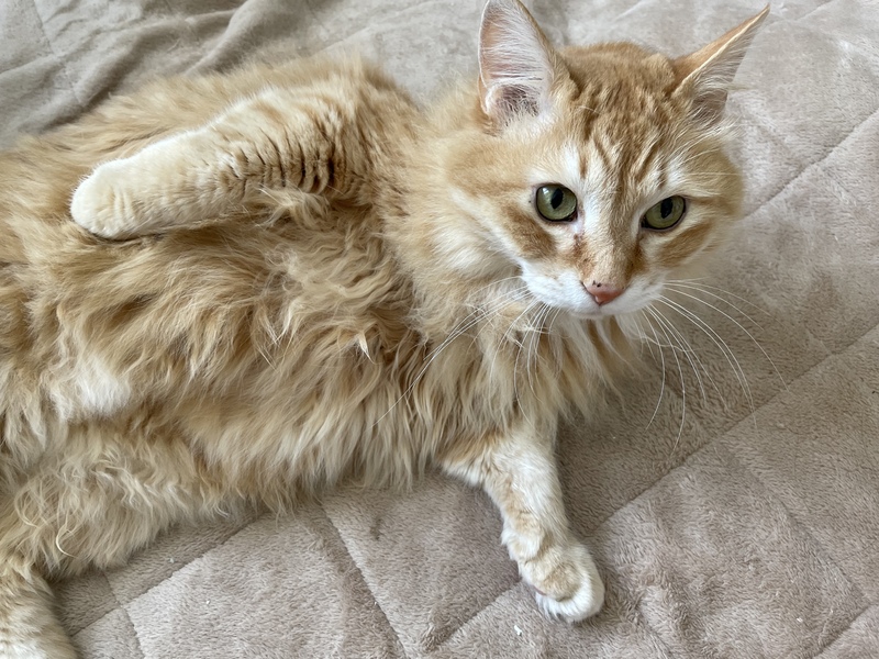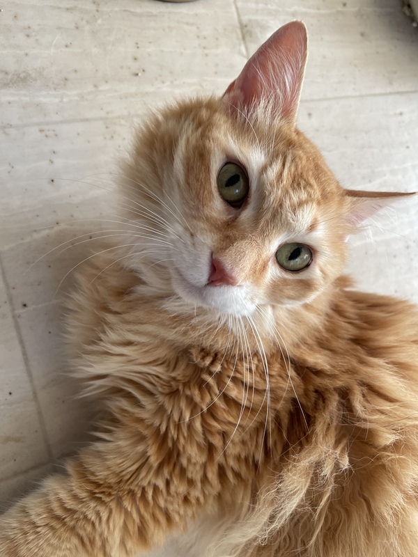 | 特徴(性格など) | 胴体はほぼ単色の茶、顔や腕など少しトラ柄。 短毛と長毛の間くらいの毛の長さで、とても毛が柔らかいです。 尻尾はフワッフワで先っぽがちょっとカギしっぽです。 人間が大好きで、家に遊びにくる友人やたまにお願いするシッターさん、水道やガスの業者さんにまで、ゴロゴロすりすりしにいきます。お腹を出したりころんと寝転んでアピールもいつもしています。 甘えん坊で、撫でて、遊んで、と結構よく鳴きます。 なでなでや体の一部をくっつけているのは好きですが、持ち上げてのだっこはちょっと嫌なようです。 寝る時も同じ部屋で放していますが、顔付近には来ず、足元や足の間にいます。 甘えるけど、好きな距離感はある猫らしい子です。 お風呂は特に入れていませんが、自分でしっかり毛繕いをし、全身ふわふわの綺麗好きです。 爪切りは少し嫌がりますが、暴れたりということはなく切らせてくれます。 特に病気はしたことがありません。 吐き戻しや毛玉を吐いたりという頻度も一般的な猫ちゃん程度だと思います。 小さい頃に動物病院に検査に行った以外、外に出たことはありません。 |
