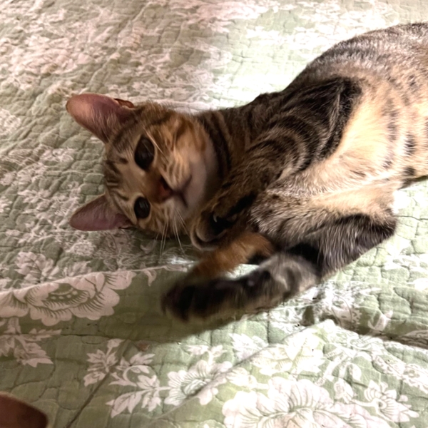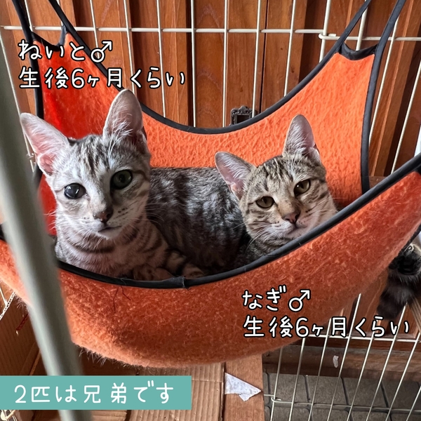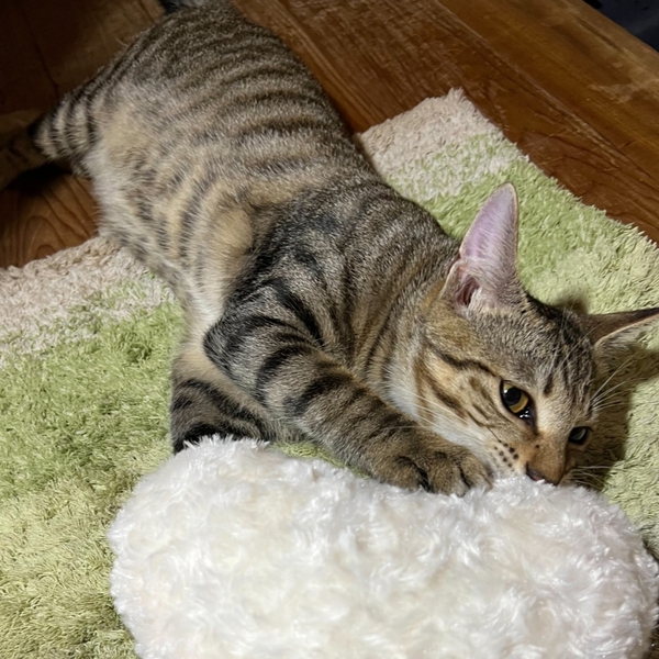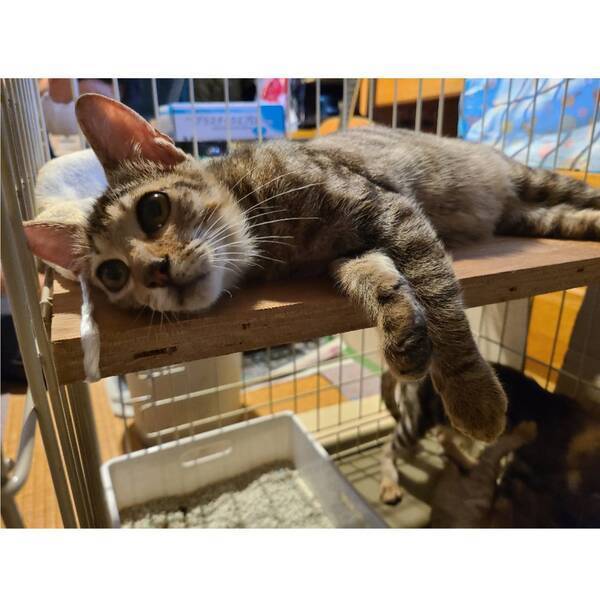 | 特徴(性格など) | キジトラの男の子です。 多頭飼育の家で生まれた子猫です。 人と遊ぶことも、猫と遊ぶことも大好きな子猫です。とても元気にボールを追いかけたり、追いかけっこしたりして遊んでいます。兄弟の中ではお兄ちゃん的な存在で、譲渡会や通院などいつもと異なる環境でも動じることなく落ち着いて、いつも通りに過ごすことができます。 お守番中はケージの中で落ち着いて過ごすことができています。ハンモックがお気に入りの場所です。 多頭飼育の家で生まれたので、他の猫とも遊ぶことが大好きです。 ごはんは、ドライフードを1日3~4回食べています。ウェットフードも時々与えています。 健康面は問題ありません。 エイズ、白血病ともに陰性です。 |