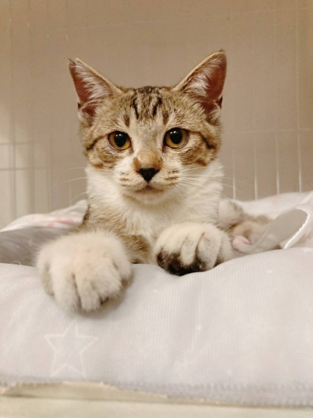 | 特徴(性格など) | 構ってちゃんの甘えん坊です♡ 猫じゃらしで遊ぶのが大好きな元気な男の子。 お団子みたいな鍵しっぽがとっても可愛いです♡ 淡いキジ白で、光の加減でゴールドっぽく見えます。 |