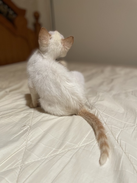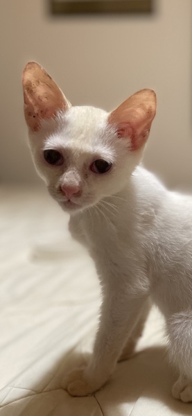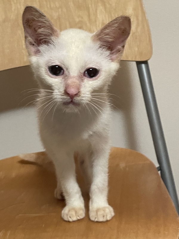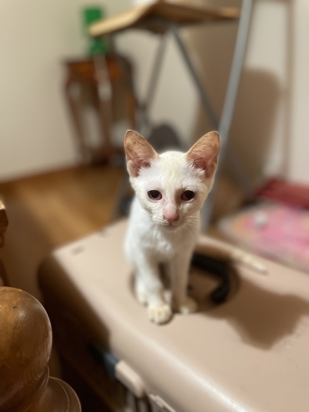 | 特徴(性格など) | ちょっとスフィンクスぽい味のある顔をした子です。耳としっぽがかすかにベージュで、残りは白。目の色はブルーグレーです。最初は警戒していましたが、人馴れしてきて、テレワーク中もすりすり寄ってきます。家具から家具へジャンブするのが大好きで身軽です。動物病院で測定したところ、体重1020g2ヶ月ぐらいだそうです。猫風邪ぎみなので、ビクシリンと目薬を投与し、治ったらワクチン投与の予定です。トイレはネコ砂にします。 | ||