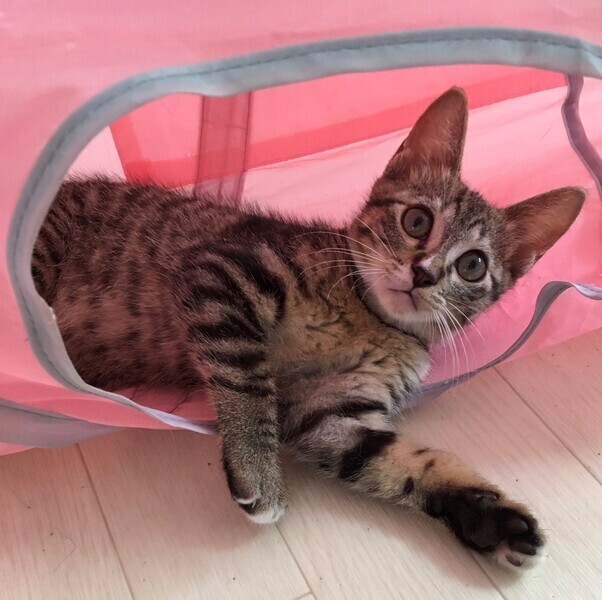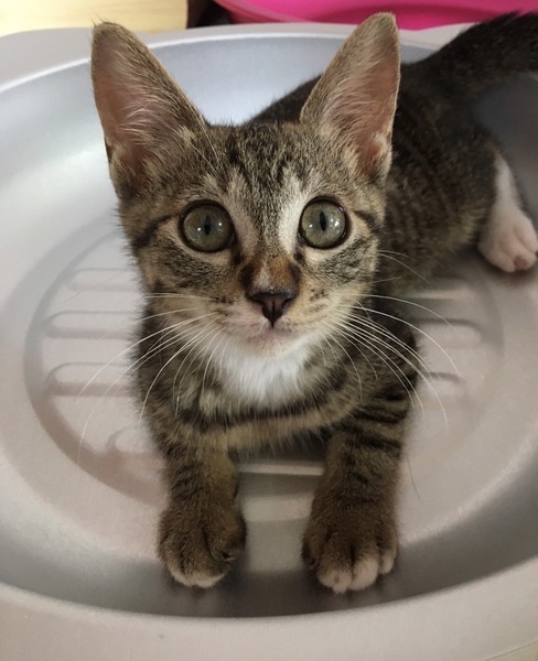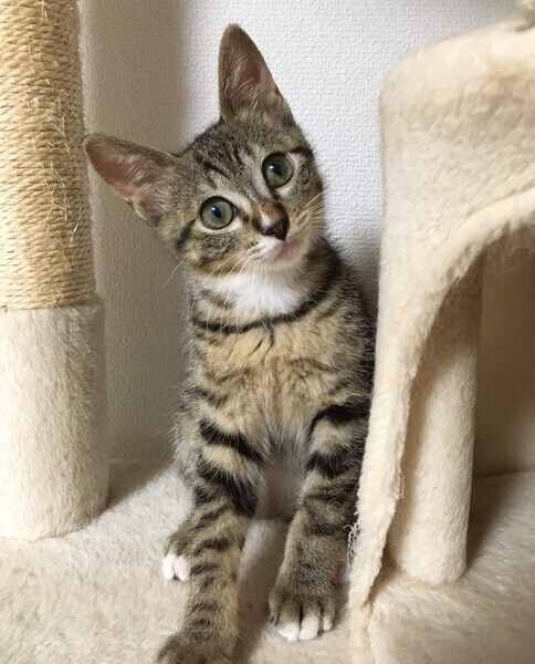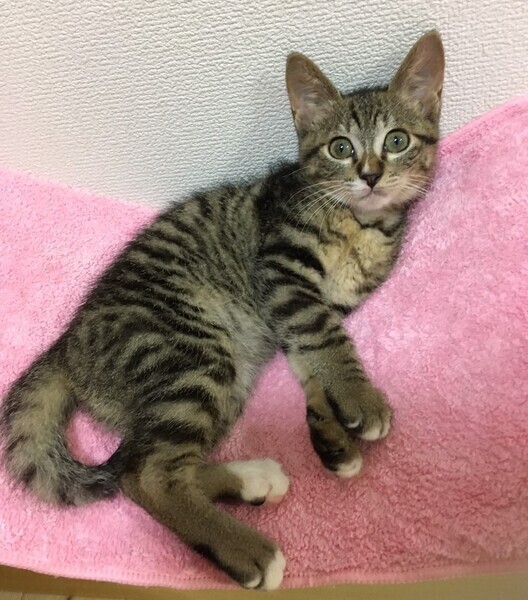 | 特徴(性格など) | 【仮名】しゅんくん 【性格】鼻の白いラインがチャームポイントのしゅんくん♪ 少しシャイですが撫でればゴロゴロと喜びますし、 人の側でへそ天で寝たりリラックスする姿も見られます。 遊びとなるとキジトラの野生味を発揮! 兄妹のなっちゃんとのプロレスは見応えありデス♪ まだまだ小さいのでお留守番が少なく 兄妹か同世代の子とのお迎えをお願い致します♪ ※1ピキ譲渡不可 |