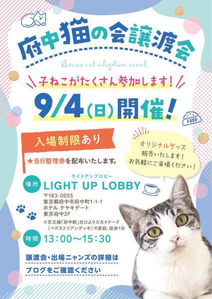 | その他(譲渡条件など) | 〓〓〓〓〓〓〓〓〓譲渡会案内〓〓〓〓〓〓〓〓〓 ♠︎令和4年 9月4日(日) ♠︎13時〜15時30分まで ♠︎会場【LIGHT UP LOBBY ライトアップロビー】 (ホテル ケヤキゲート 東京府中2F) https://lightup-lobby.com/ ※会場に直接のお問合せはご遠慮下さい 〒183-0055 東京都府中市府中町1-1-1 ホテル ケヤキゲート 東京府中2F 京王線「府中駅」北口より スカイナード(ペデストリアンデッキ)で直結 ▼駐車場はありませんので、お車でお越しの際は近隣のパーキングエリアをご利用ください。 ▼徒歩1分施設内に駐輪場あり ▼ホテルのフロント入り口からは入れません 【譲渡会の会場についてのご案内】 ↓↓↓ https://chuneko.exblog.jp/32603337/ 【電車でご来場の方】 駅からスカイナード直結に来ると、ホテルのフロント入り口が見えて来ます。そこにいるスタッフにお声がけください。 【けやき並木通りからご来場の方】 ココカラファインさんとカフェ•ド•クリエさんの2階が会場となっております。エレベーターや階段を使って2階に上がって来てくださればカフェの入り口が見えてきます。 〓〓〓〓〓〓〓〓〓〓〓〓〓〓〓〓〓〓〓〓〓 ▶今回参加する保護猫達は、少し大きめの去勢or避妊手術をした子猫ちゃんも参加します。 参加頭数は17匹(子猫16匹)予定しております。 ▶生後約3ヶ月〜4ヶ月半ぐらいの子達です。生後4ヶ月以上の子達は避妊or去勢手術済みです。 ▶子猫ちゃんを希望される方は、お留守番の時間等、譲渡会スタッフにお問い合わせください。 小さい子猫は長時間のお留守番はできませんが、大きめの子猫は半日ぐらいのお留守番ならば可能です。 ▶成猫ちゃんを希望される方は、フルタイムでお仕事をお持ちの方でも問題なく迎えていただけます。 ◎コロナ対策の為、入場制限をさせていただきますが、ご予約の必要はございません。 入り口カウンターにてスタッフが整理券を配布いたしますのでご協力お願い申し上げます。 ◎初めて猫ちゃんを迎える方(特にお子様のいるご家庭)は、猫アレルギー検査の有無を明確にしてくださると私達も選考しやすいです。 ◎譲渡会にご来場する前に必ず下記の事項をご参照ください。 【猫を迎えたい方必見 譲渡会のシステムについて】 ↓↓↓ https://chuneko.exblog.jp/32604872/ 【譲渡者(里親様)対象となる選定基準について】 ↓↓↓ https://chuneko.exblog.jp/32604879/ ◆グッズ購入やご見学の方々へ◆ カフェも営業しておりますのでどうぞお気軽にお越しください!と申し上げたい所ですが、会場の混雑によってはお待たせしてしまうかもしれません。 カフェでお飲み物をご注文くだされば、中にご案内させていただきます。 尚、里親希望者様を優先に会場にご案内させていただきますのをご了承の上、お越しいただければ幸いです。 よろしくお願い申し上げます。 |