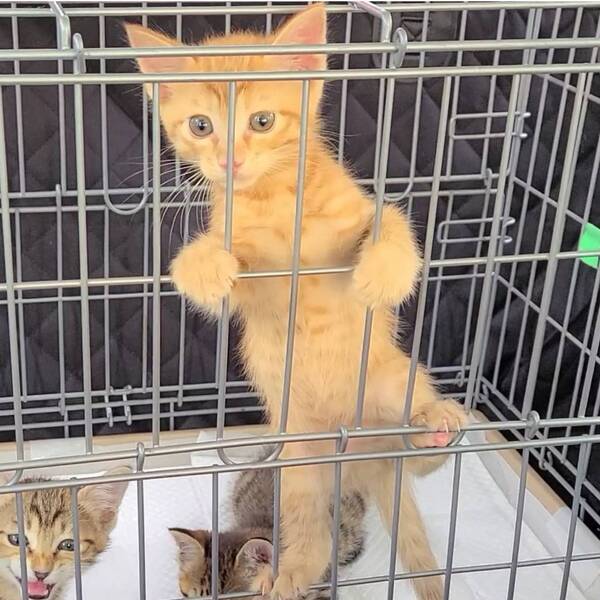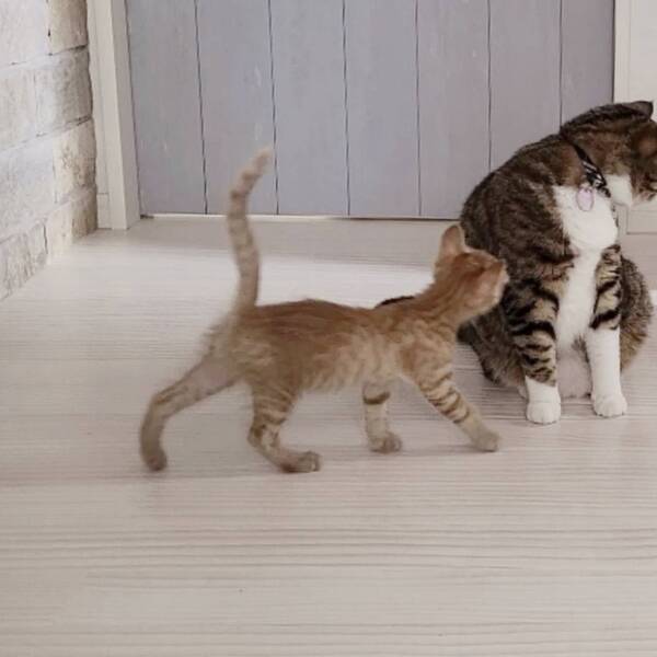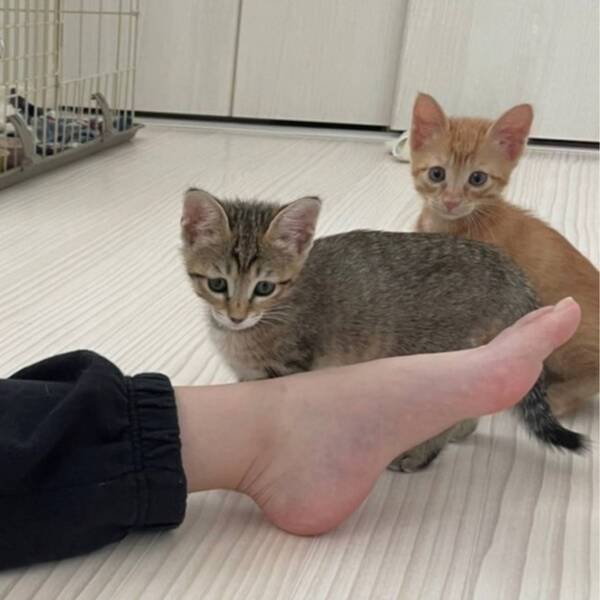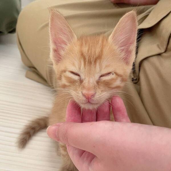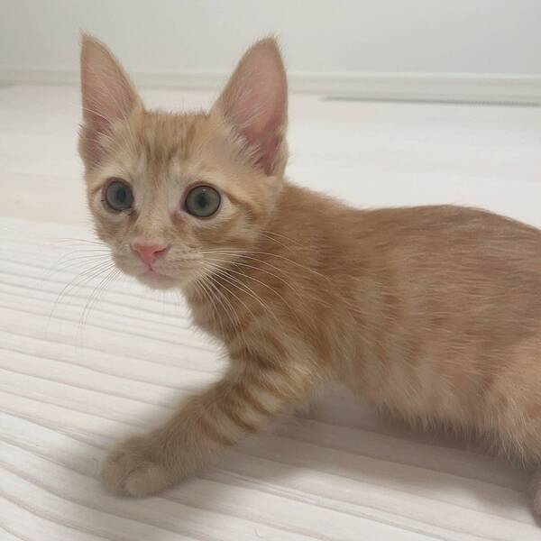 | 特徴(性格など) | 茶トラの男の子です。 人と遊ぶことも、猫と遊ぶことも大好きです。好奇心旺盛な子猫で、新しいおもちゃを与えるとすぐに興味津々に近付いてきたり、高い所へ登ることにどんどん挑戦したりしています。今はネズミのおもちゃがお気に入りです。 基本的にはケージの中で落ち着いて過ごしており、お留守番中のイタズラなどもありません。 骨格がしっかりしていて、前足も大きい男の子なので大きく成長しそうです。 ごはんは、ドライフードを1日4回食べています。ウェットフードも時々与えています。ウェットフードをトッピングすると食い付きがとても良いですが、食いしん坊なのでドライフードだけでも良く食べています。 健康面は問題ありません。 エイズ、白血病ともに陰性です。 |