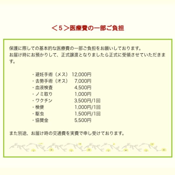 | 譲渡費用(医療費、交通費など) | ウィルス検査 陰性 4,500 円 ワクチン1回 3,500 円 駆虫1回 1,500 円 検便1回 1,000 円 蚤取り 1,000 円 協賛金 5,500 円 合計金額 17,000 円 譲渡費用に関する注意事項 : お届けの際の往復の交通費別途負担をお願いしています |