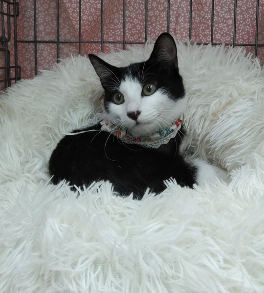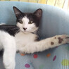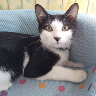| 特徴(性格など) | 兄弟たちと一緒に保護しました。しろんの妹猫です。 当初は兄弟で一番怖がりで緊張していましたが、今ではもっと撫でて、とすり寄って抱っこもできます。くっきりハチワレに、鼻が黒くてかわいいです。毎日元気に走りまわっています。 |