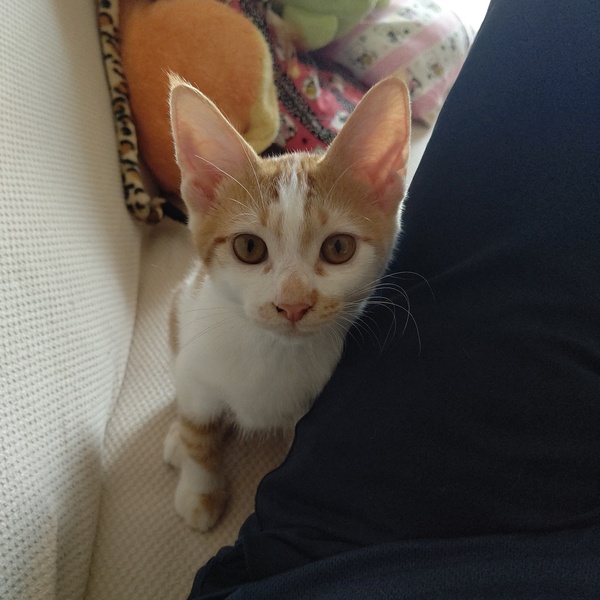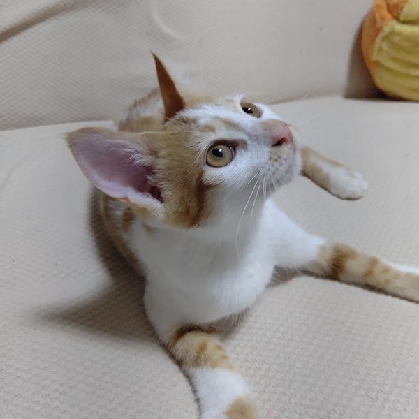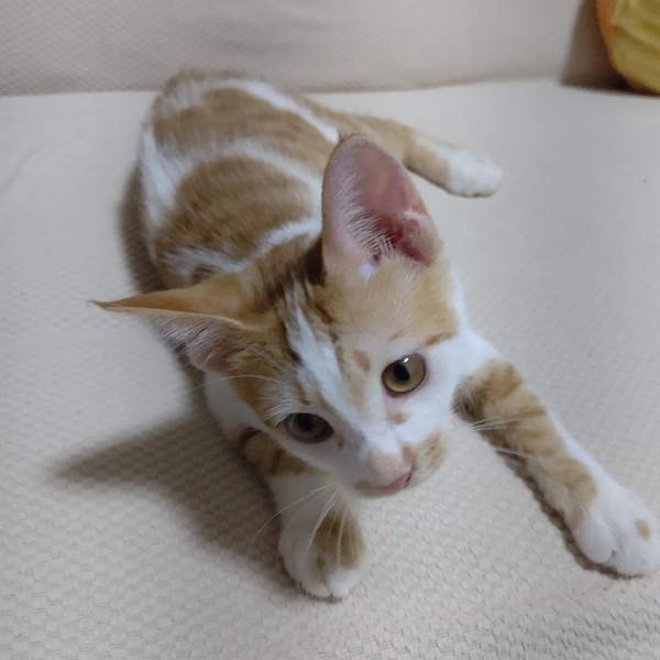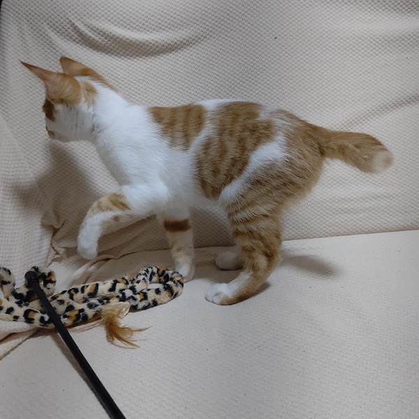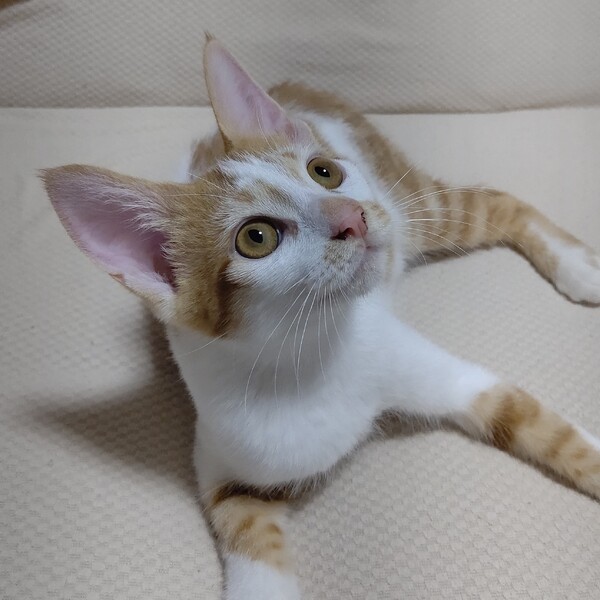 | 特徴(性格など) | 薄めのブラウンの瞳が綺麗な白茶柄です。 とにかくとても元気でやんちゃです。 遊ぶのが大好き!おもちゃも大好き! 人と遊んだり、大人猫ちゃんとも遊びたがります。 一人遊びもできる子ですが、同年齢ぐらいの猫ちゃんのお友達がいるときっと仲良くなれると思います。 遊び疲れると、人間の膝の上や傍に来てゴロゴロと甘え始めます。 抱っこ、爪切り、おトイレもできます。 【健康状態】 駆虫済み、検便済み 3種混合ワクチン2回済み 血清検査 FeLV( - ) FlV( - ) 動物病院から、7月15日時点で7週齢ぐらいと言われたので、5月末生まれと思われます。 保護後、検便でカンピロバクターとコクシジウムが見つかり、それぞれ服薬による治療もしていました。 検便は3度行い完治していますが、念の為もう1度やる予定です。 他は目ヤニ、鼻水、くしゃみも無く健康そのものです。 |