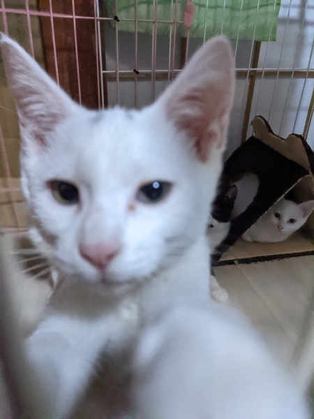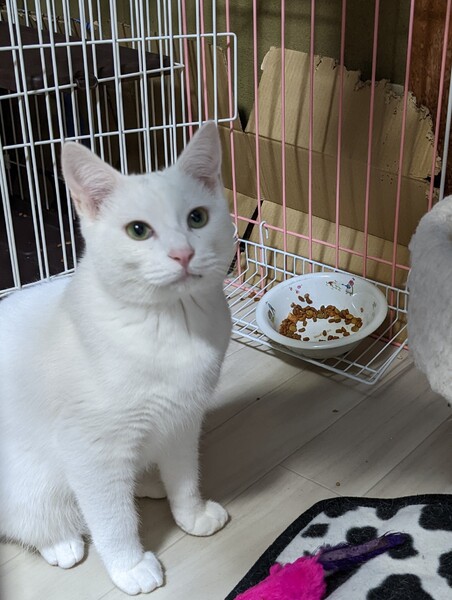 | 特徴(性格など) | 真っ白ですが頭にグレーの模様があります。人懐こくかわいい声で話しかけてくれます。 | ||