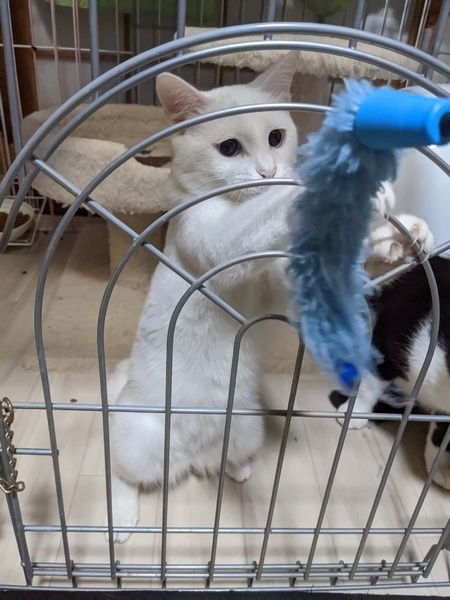 | 特徴(性格など) | 真っ白で目がブルーです。 少し人を怖がりますがケージの中では元気に遊べます。猫じゃらしを見せると走ってきます。 |