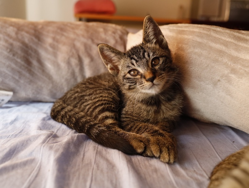 | 特徴(性格など) | 濃いめのきじの男の子ひできちくんです。 メランコリックな表情がウリ。 もちろんやんちゃ盛りの子猫ですから、元気に妹たちを従え追いかけっこをしています。 兄と妹2頭の3兄妹です。 |