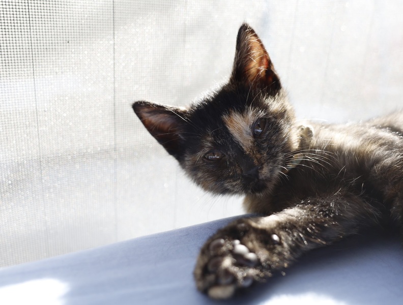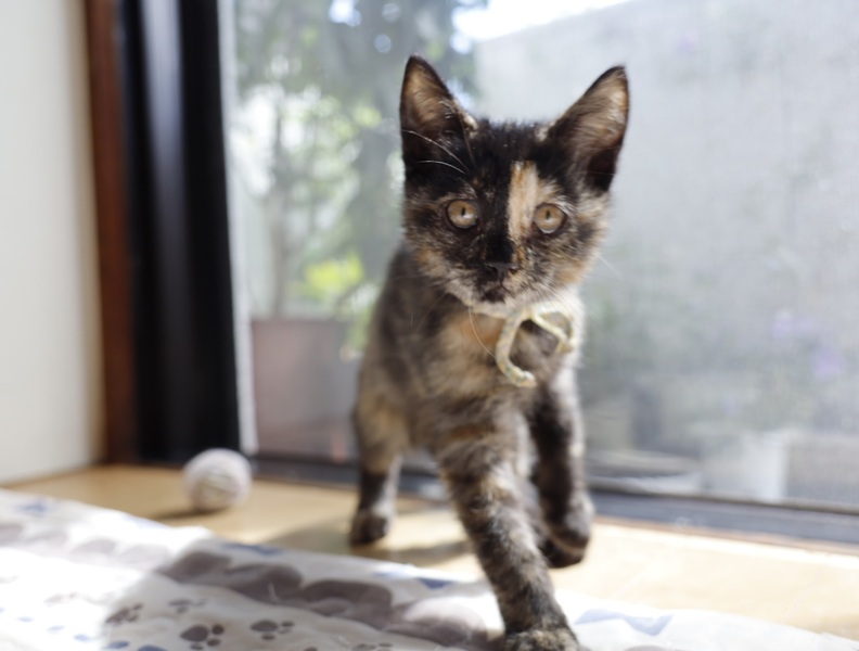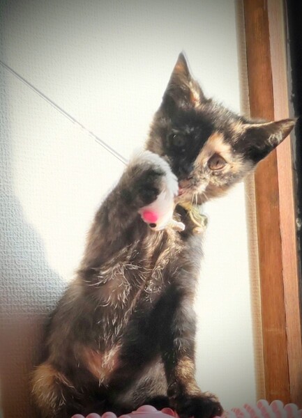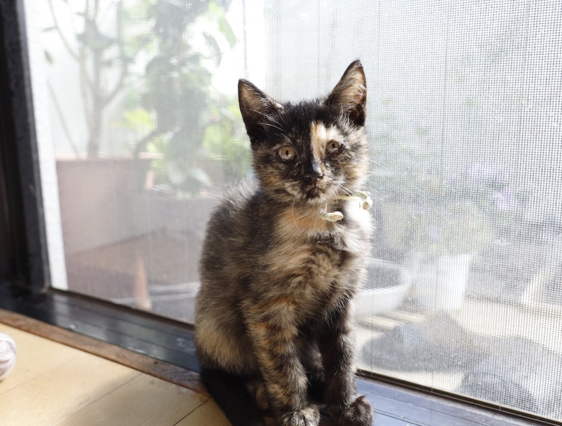 | 特徴(性格など) | 黒と茶のユニークな顔つきの茶々ちゃん、女の子です。 一般的にサビと言われる色ですが、サビは控えめで優しい子が多いです。 茶々ちゃんも今は子猫でおてんばさんですが、大きくなるにつれ大和なでしこになると思います。 |