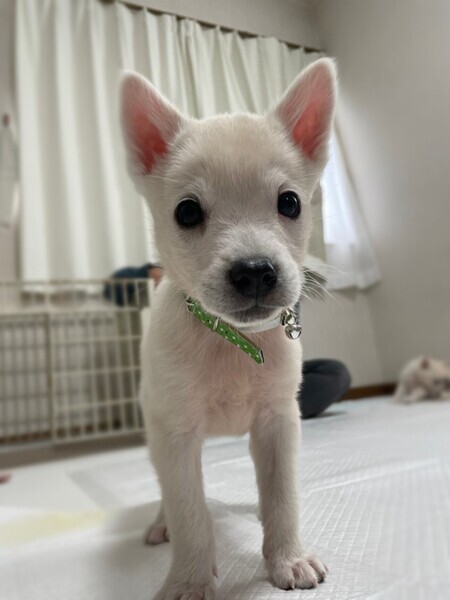 | 特徴(性格など) | 【仮名】チョコミント 【生年月日】推定2022年7月中旬頃生まれ 【種類】MIX 【サイズ】親犬は不明ですが、成犬時は中型犬(10〜15kg)ほどを予想しています。 【毛色】ホワイト 【性別】オス 【性格】おっとりマイペースです。 少しビビリで大きな音などがするとビクッとして物陰に隠れますが、甘えん坊で足元に寄って来てピッタリとくっついてきます。 ゲージを開けると出てきて遊んで~撫でて~と寄ってきます。 トイレはフリーではトイレシートも何となく認識しています。 ゲージの中では100%成功します。 小さい子供とも一緒に生活しています。 【去勢】未(適正時期に必ずお願いします) 【ワクチン】未 【駆虫】フォートレオン、ドロンタール、済 【健康状態】食欲もあり元気です。 兄妹 チョコチップ ぽっつん ムーすけ |