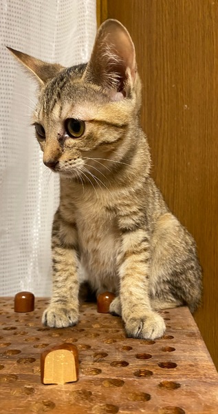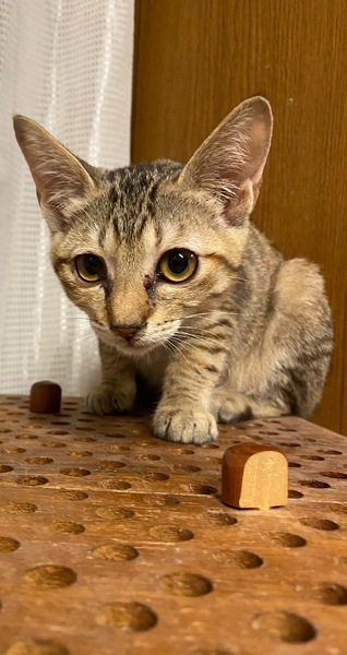 | 特徴(性格など) | こちらに来たときは、緊張していましたが、すぐに馴れ、今では人懐っこく、穏やかに過ごしています。好奇心も旺盛です。ハンモックが大好きで、兄弟猫と一緒にくっついて楽しんでいます。 エイズ、白血病は陰性です。 |