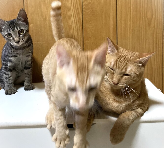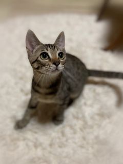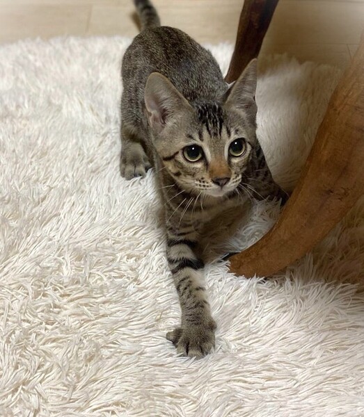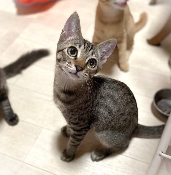 | 特徴(性格など) | 大きなたれ目が特徴的 細かいスポット状のしましま柄・男の子 環境に慣れるまで、少し時間が必要です。 食いしん坊でやんちゃ坊主 とても元気な子です。 柔らかご飯大好きで、レトルトを出そうとするだけでゴロゴロご機嫌さんになります。 |