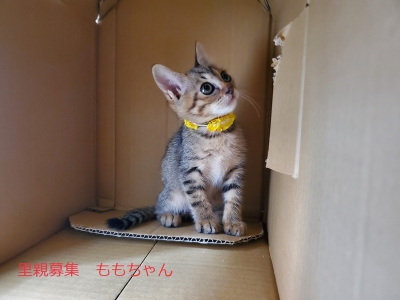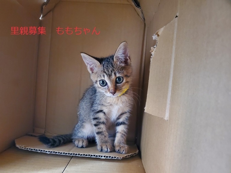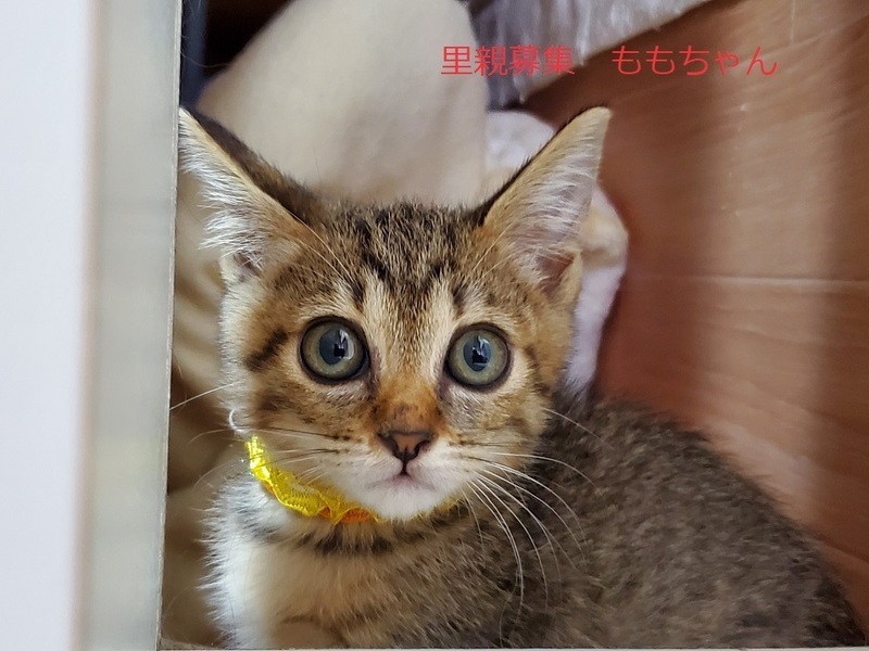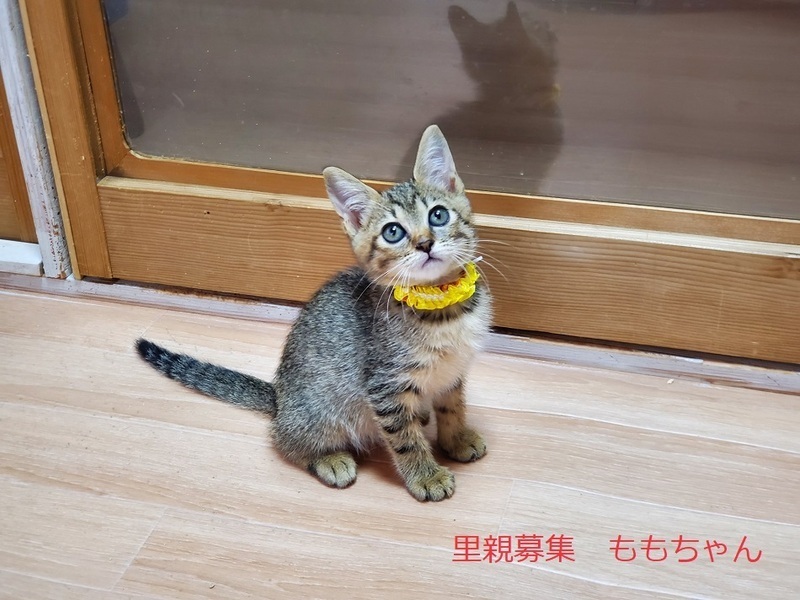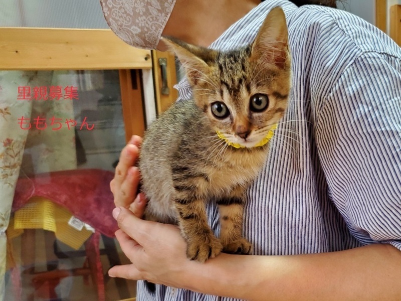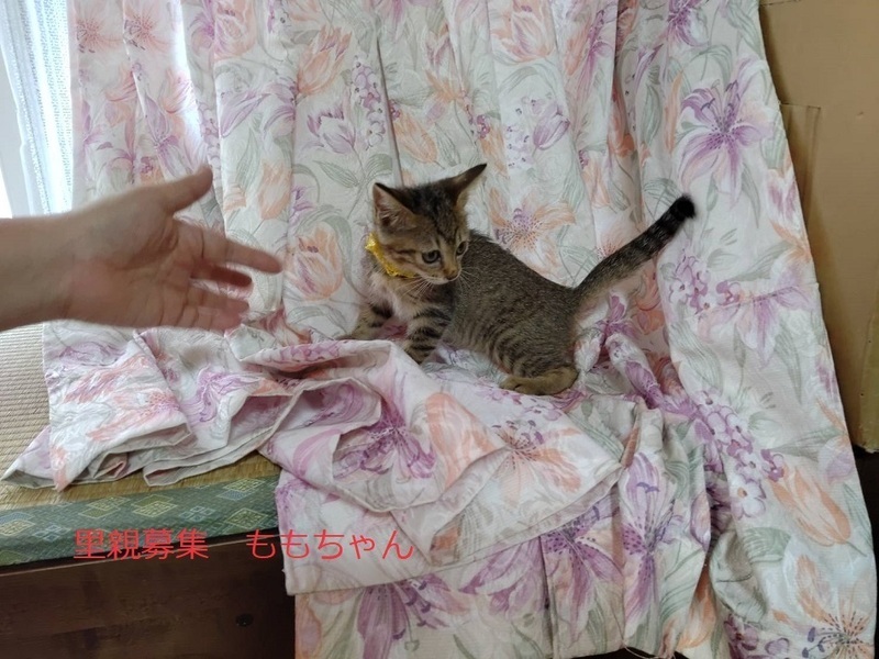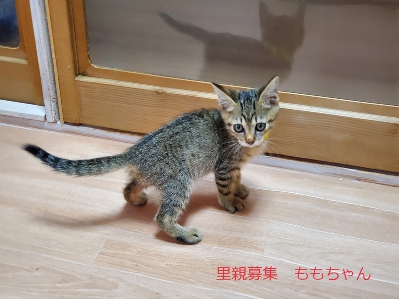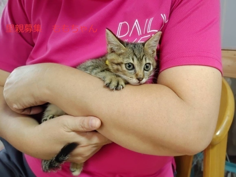 | 特徴(性格など) | キジトラ子猫、女の子、仮名:ももちゃん 推定1ヵ月半くらい、体重:600g(9/2現在)、 健康診断済み、駆虫済み、 トイレしつけ済み ワクチン、ウイルス検査は、生後2ヵ月になりましたら実施します。 人が大好きで猫とも仲良く遊んでいます。 まん丸な目で可愛らしい子です。 9/18 ウイルス検査-エイズ・白血病-共に陰性。 9/27 初回三種混合ワクチン接種済み。 |