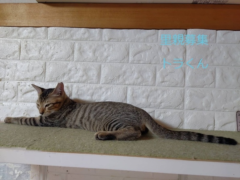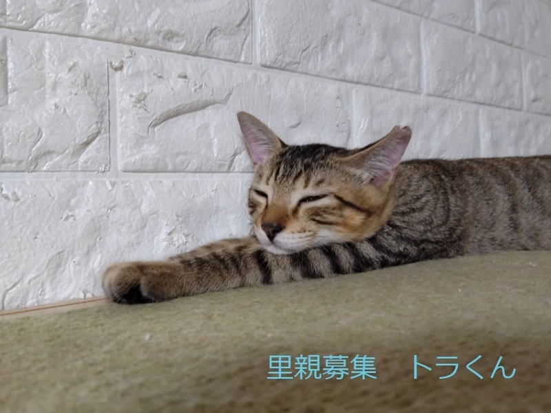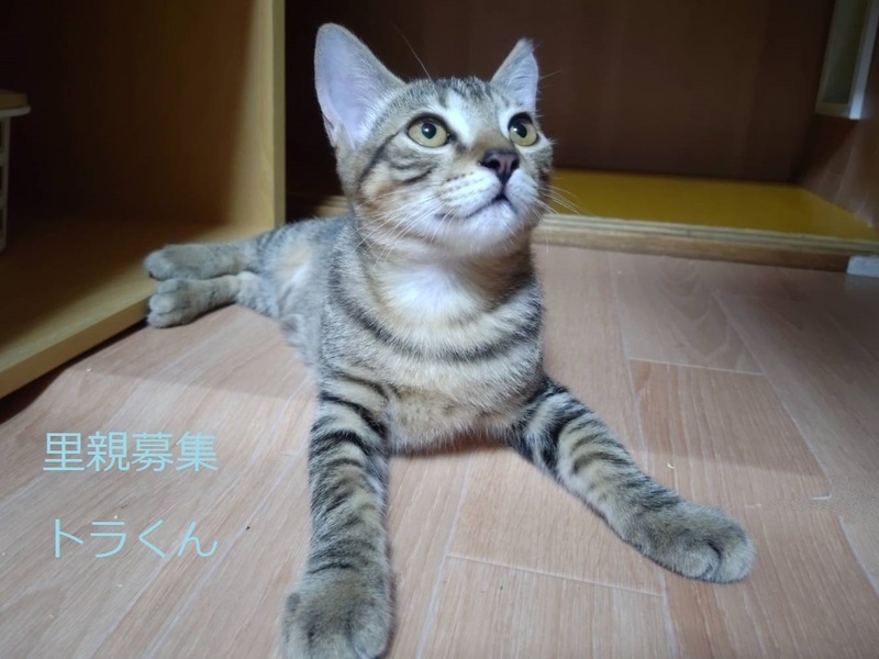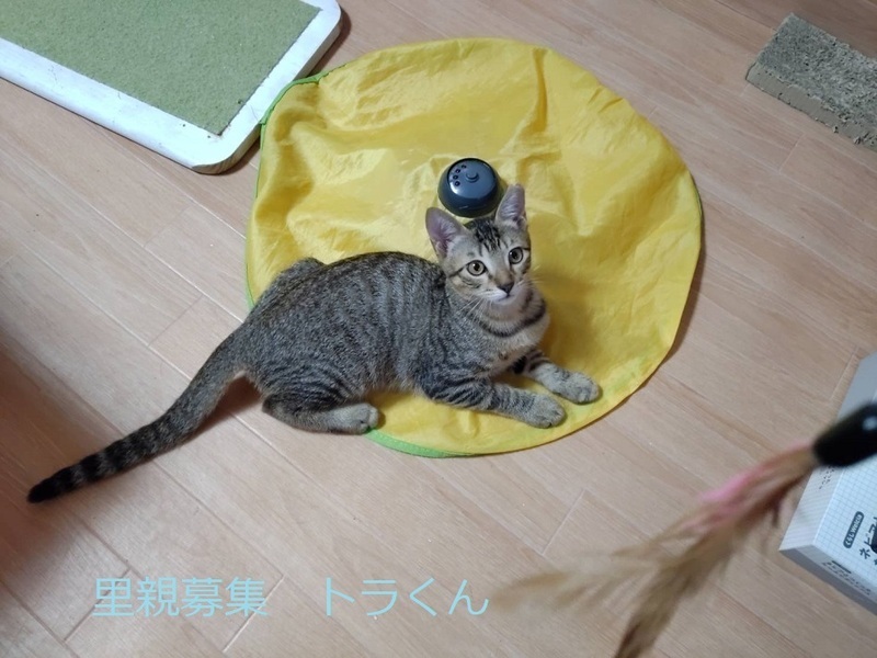 | 特徴(性格など) | キジトラ子猫、男の子、仮名:トラくん 推定4ヵ月くらい、体重:2kg(9/10現在)、 健康診断済み、駆虫済み(ブラベクトプラス8/21) 三種混合生ワクチン済み(8/21) 去勢手術済み(8/21) トイレしつけ済み 人慣れ抜群です。好奇心旺盛で元気に遊んでいます。猫とも仲良しです。 9/27 血液検査-エイズ・白血病-共に陰性。 |