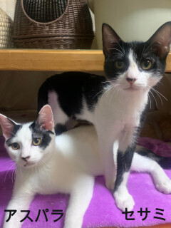 | 特徴(性格など) | ☆★☆★現在お見合い予定がございます☆★☆★ 仮名を『アスパラ』と言います。 白黒ブチの男の仔です。 センター収容猫です。 尻尾はまるで墨汁の付いた筆のよう♪ 付け根が白く、先端に行くにしたがって黒くなっています。 おっと.....! 猫神様のお茶目なイタズラ.....ではなくて計らいで、付け根に一部黒い墨模様があるのでした★ 人間好きも相当なもので、ツン0デレ10な割合です。 目が合うだけでゴロゴロ♪ゴロゴロ♪ 嬉しくて仕方がないといった、いつもハッピーで居られるこです。 他の猫とも上手く共生しています。 愛らしいアスパラに会いに来てくださいね。 【医療処置情報】これから実施のも含まれます *健康チェック *3種混合ワクチン接種 (年1回定期的にしております。詳細はお見合い時にお知らせいたします) *ウイルス検査実施(FIV.FeLV共に陰性) *検便実施 *駆虫薬投与(レボリューション、ドロンタール) *マイクロチップ装着 *不妊・去勢手術 |