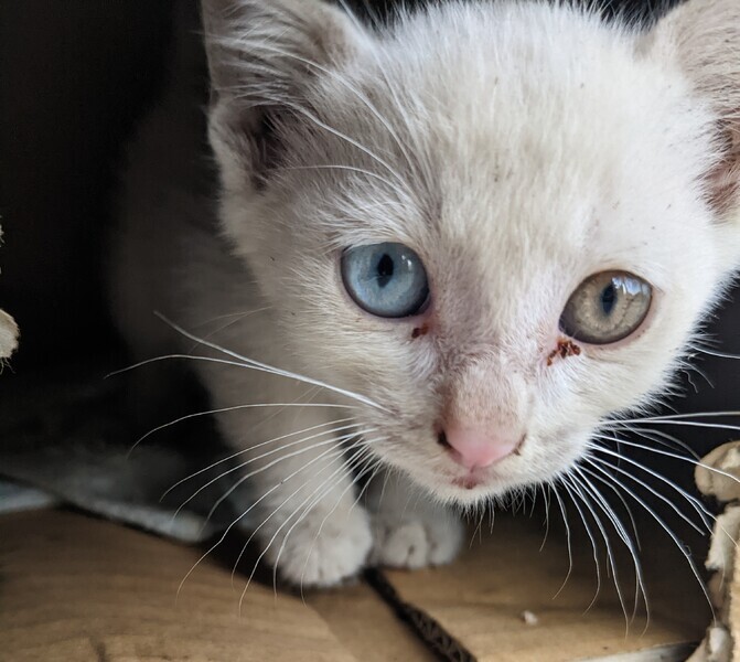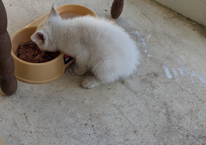 | 特徴(性格など) | 真っ白のオッドアイの仔猫です。 人が近くにいるときは逃げます。 近寄ってきません。 エサを入れると人がいても食べに行きます。 人が近くにいるとき以外は鳴かなくなりました。 トイレはしっかり覚えています。 |
