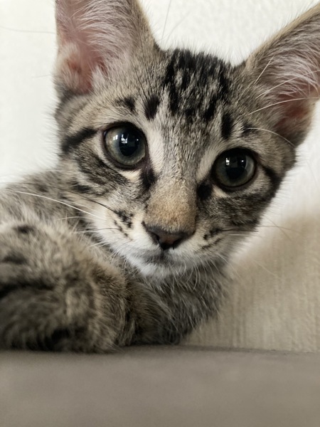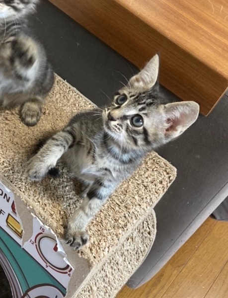 | 特徴(性格など) | 身体能力バツグン! よく食べ、よく寝、よく遊ぶ! とても人懐っこく、触る前から、近寄っただけでゴロゴロ言い始めちゃいます。 抱っこはお腹が上向きの抱っこより縦抱っこが好きです。 夜は兄弟と一緒に人に寄り添って布団で寝ます。 最初のトイレトレーニングから1度も失敗したことがない賢い子です。 |