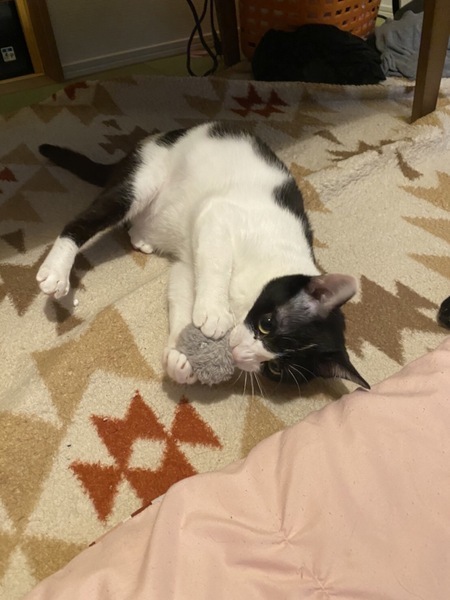 | 特徴(性格など) | オモチャ大好き! 1人遊びがとても上手な子です。 お気に入りのボールを咥えて自分の好きな場所に持っていき好きに遊んでます。 ご飯・オヤツに好き嫌いは無さそうで、保管してある扉を開くと音を聞きつけて走って駆け寄ります。 いつもはツンツンしてるのに部屋に2人きりだと甘えた声で擦り寄ってきて猫らしい一面あり。 ツンデレくんです。 ニー君と兄弟で一緒に良く遊んでます。 おしゃべり好きで色んな鳴き声で可愛いです。 |