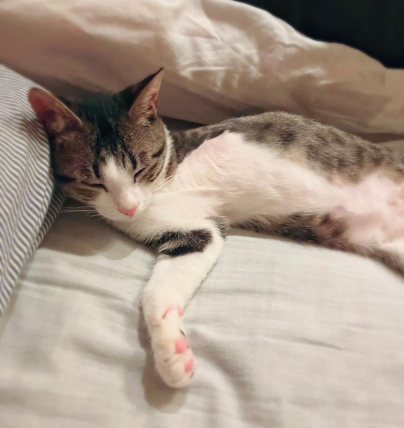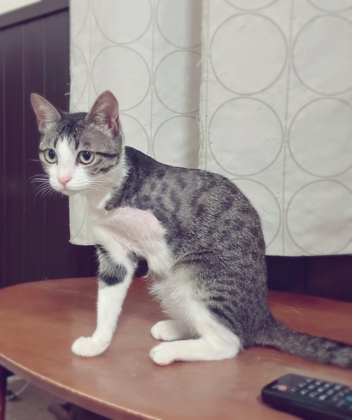 | 里親募集する理由 | 某地区のTNR時、手を引きずっていた猫です。捕獲し病院受診、既に骨が複雑に折れ手首がぶら下がり膿もある状態、また引きずる事により感染の恐れがあり、左前脚断脚手術になりました。 また、左足指2本無く、左犬歯の破折があり、幼少期に左側になんらかの衝撃が加わったとみています。 |