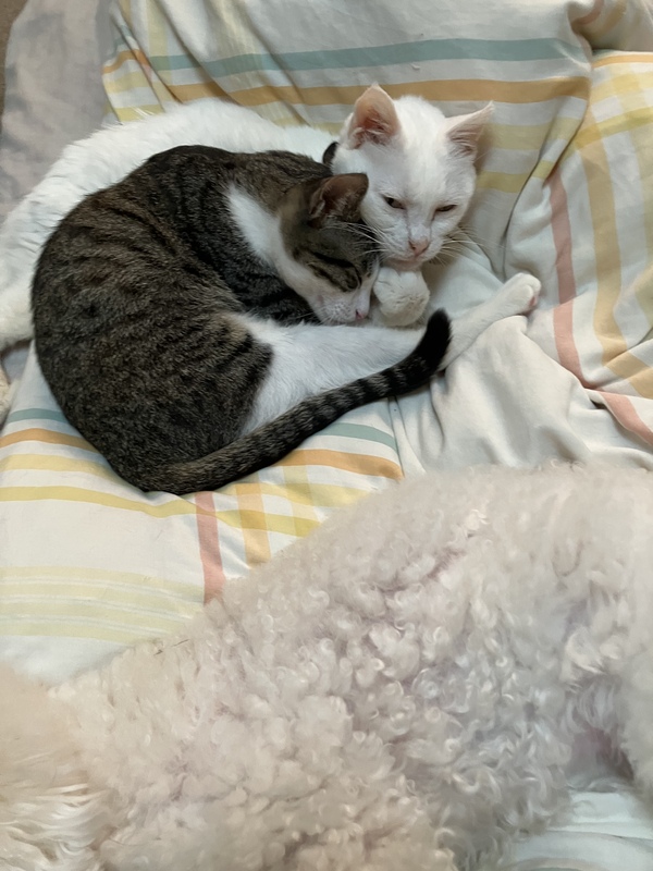 | 特徴(性格など) | ?やおきくん ?男の子 ?キジ白 ?約6ヶ月(小柄) ?エイズ、白血病陰性 ?ノミダニ駆除済 ?便検査済 ?ワクチン接種済 ?去勢済み ・左前脚の断脚 ・左足指2本ありません ・左犬歯の破折 猫が大好きなやおき君。 来てそうそうに猫に興味がありすぐ仲良くなる友好的な子です。 片腕となりましたが、負けずと走り回ったり、駆け登ったり生活に馴染めています。 3段ケージもお構いなし、一番上でいつもくつろいでます。 登ったり降りたりは最初は慎重にしてましたが、今は全て自ら考え、こちらが手を加えることなく出来ています。 トイレも右手でカキカキでき(たまに無い手でカク仕草はあります)問題なく排泄できます。転んだりはありません。 歩行時に右手に体重はかかるかもしれませんが、本人も考えながら生活できるため、本人のペースに合わせています。 撫でるとゴロゴロ言ってお尻を上げ、寝そべり最長に伸びをして喜びます。 ご飯時は特にまとわりついて綺麗な声でこちらをずっと見ます。急に近づいたりするとビックリして逃げます。 基本的に人にはあまり興味がなく甘え方がわからなかったと思います。自分から行きたいタイプです。 |