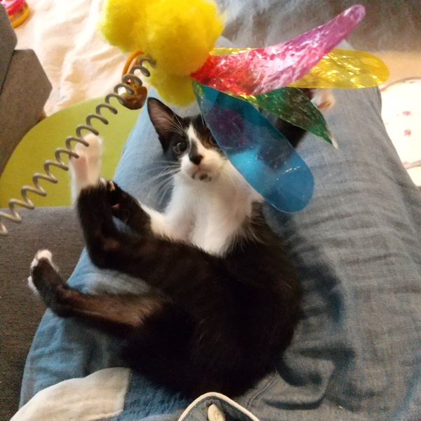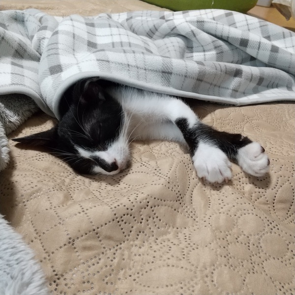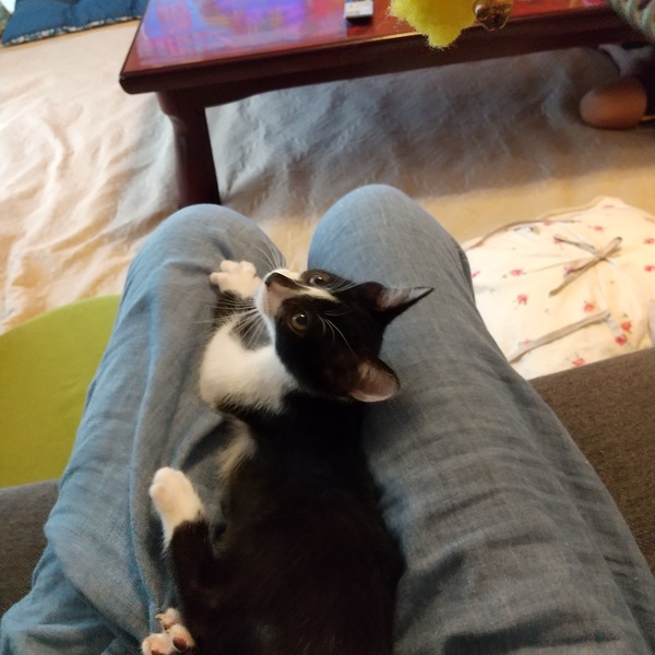 | 特徴(性格など) | 名前の由来でもある、短め鍵しっぽ! 短いなりにプリプリ動かして感情豊か♥️ 兄弟2匹で追いかけっこ、プロレス、かくれんぼと毎日大忙し!疲れると、先輩猫や人間の近くでスヤスヤ~。 ハチワレと鼻筋メイクのイケメン顔。 すぐゴロゴロ言っちゃう。お膝の上大好き 検便、ノミダニ虫駆除済、エイズ白血病ウイルス検査(陰性)、3種ワクチン接種一回目済、レボリューション済み、健康状態良 |