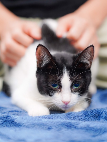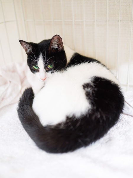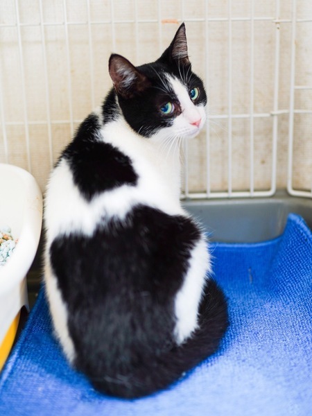 | 特徴(性格など) | ハチワレ好きにはたまらない、綺麗な白黒ハチワレ女子です。かなりのビビリさんで、人や環境に慣れるまでには時間がかかるかもしれませんが、撫でられるのは好きな甘えん坊タイプです。ゆっくり時間をかけて気長に付き合っていただける方にオススメです。 検便マイナス 3種ワクチン1回接種済 レボリューション エイズ白血病ウイルス検査陰性 |