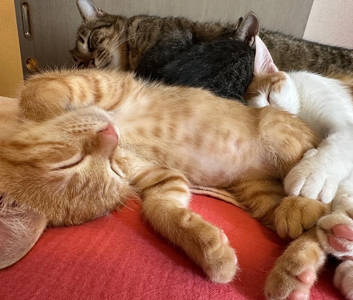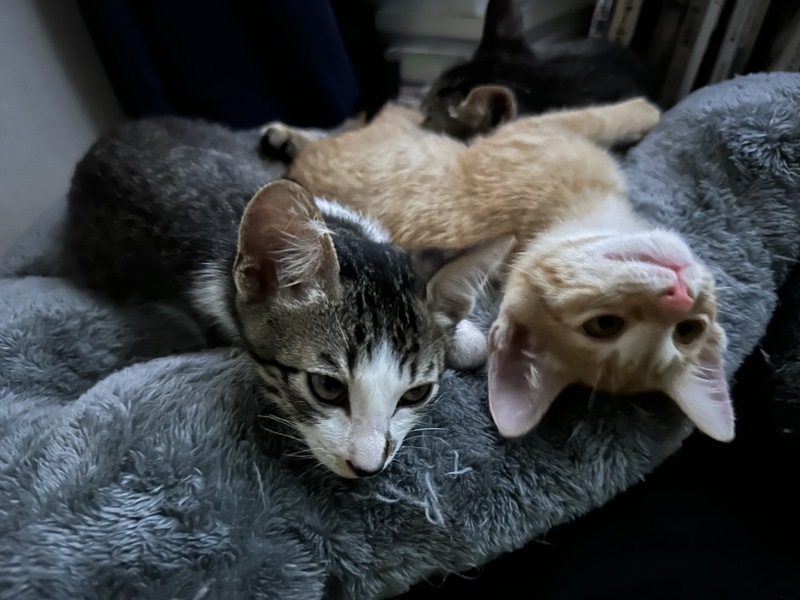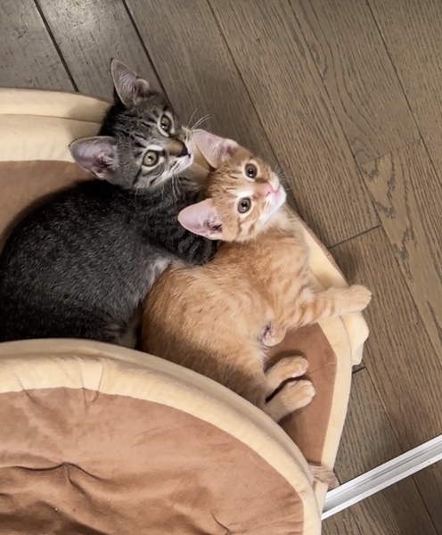| 特徴(性格など) | *特徴 全身にキレイな縞模様が入っている王道の茶トラ君です。尻尾はほぼ真っ直ぐですが、先っぽが少し曲がっています。 *性格 幼齢で6兄妹が皆一緒に保護されたせいか、警戒心が全く無く、兄妹達と仲良く元気いっぱいに遊んでいます。 食いしん坊で、ごはんの用意をしている間はずっと催促コール!その鳴き声がまだまだ赤ちゃんでめちゃめちゃ可愛いです。 ごはんの後のひと遊びは兄弟と一緒に大ハッスルしています。おもちゃがなくても子猫さん同士で転げまわって楽しそうに遊んでいます。そしてしばらくすると遊び疲れてコロッと寝ちゃうのがまた子猫さんらしい一面で、びっくりする程お部屋が静かになります。 夜も保護主のベッドで一緒に寝ています。保護主が起きるまで一緒に寝てくれるので、朝早くから起こされる事がなく助かります(笑) ちょうど今くらいの時期から4ヶ月くらいまでの間は、子猫さんの社会性が育つ時期になります。取っ組み合いの喧嘩をしながら、甘噛みを覚えたり、追いかけっこしながら、動体視力を養っていきます。 できれば、2頭一緒に迎えてくださるお宅や一緒に遊べる若い先住猫さんがいるお宅、お留守番があまり長くなく猫さんと一緒に遊ぶ時間が十分取れるお宅を優先させていただきたいと考えております。 ご理解くださいますよう、よろしくお願いいたします。 |