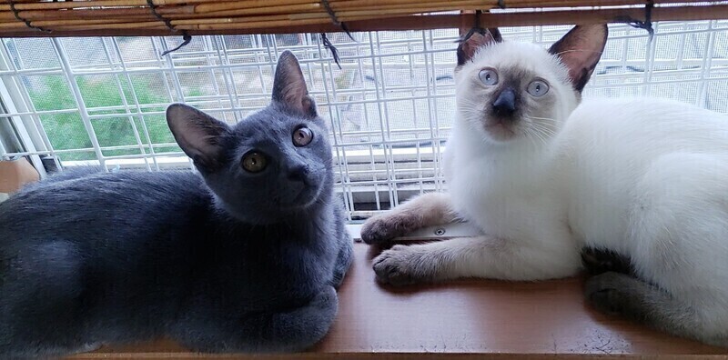 | 特徴(性格など) | 【預かり・代理投稿です】 ロシアンブルー系と シャムのような珍しい洋猫系 兄妹です ○マーチ君 スモークグレーの毛色 手足尻尾が長い スタイル抜群の男の子 見た目によらず超ビビリ コアラちゃんの様子を 見ながらゆっくり慣れて いく子です。 慣れてきた時の寝方が ビローンと伸びきって 可愛いです ○コアラちゃん 大きなマスクがキュートな コアラ顔 薄ブルーの目 栗色のグラデーションが綺麗な シャム系女の子 好奇心旺盛オモチャ大好き 遊んで寝て寝たら中々 起きません 過酷な環境で頑張って来た為 ウーシャーのご挨拶 <(_ _)> グレーは強めのご挨拶 2日目より徐々におさまり コアラちゃんは3日に撫で撫で ('-^*)ok マーチ君は5日目に撫で させてくれました。 時々見せる寂しげな目 甘え方知らずで本当は 甘えっ子かもしれません。 ○ビビリな私が預かり 1カ月 手にお皿を持ったままでも たべます。 膝にお皿を置くと膝に乗って 食べてくれます ドア前でお出迎え? オモチャで遊んであげると 遊び、私の近くを通る時 チラ見する姿やトコトコ足音 も可愛いく少しづつですが これからが楽しみで少しの変化 でも嬉しさ倍増です (○´∀`○)(○´∀`○) ○1日の様子 昼間はほとんど寝ており 泣いたりせず留守番の心配 ありません 夜は運動会が開催され 笑顔にしてくれます 仲良く遊んだり 寄り添う姿はホッコリ 癒されます。 里親様に可愛がって頂きたい為 人慣れして良い子になりますよう 日々励んでおります。 ○健康管理 ワクチン接種済み 血液検査エイズ、白血病 ともに陰性 初回健康チェック済み |