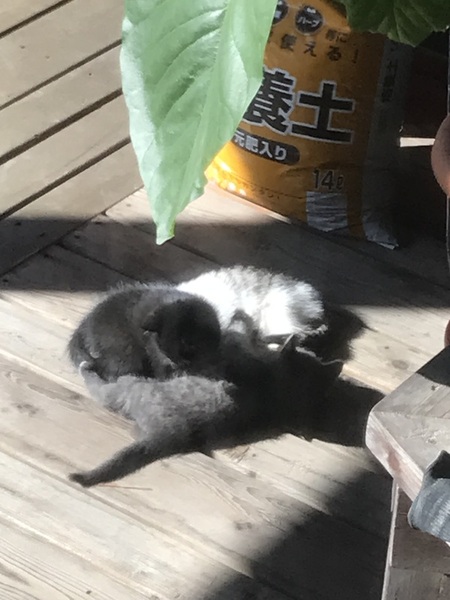 | 特徴(性格など) | 親猫はとても人懐っこく撫でても爪を立てるようなことは一度もありませんでした。 子猫たちはまだ慣れていないのか物陰に逃げてしまい捕まえることもできません。 親猫はグレーと白 子猫はキジと白 グレー 黒猫です。 |