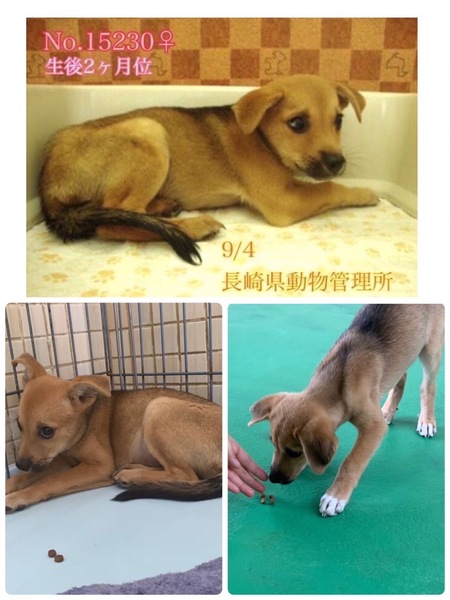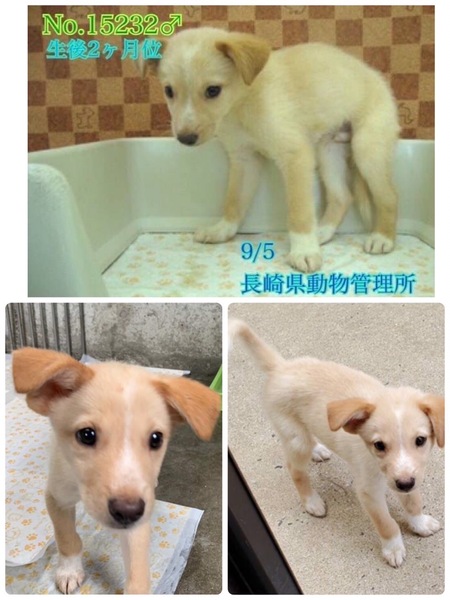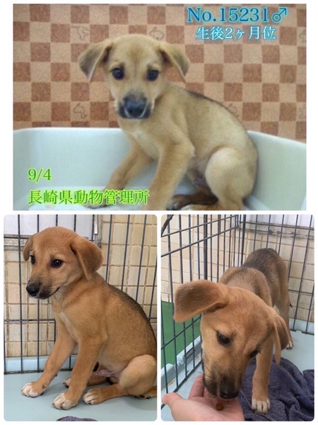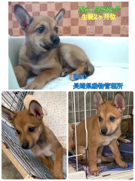 | 特徴(性格など) | 〜追記〜 あと1匹になりましたฅ•ﻌ•ฅ ♡まだ生後2ヶ月位、野良ちゃんが生んだとっても可愛い雑種の子犬4匹(男の子3匹と女の子1匹)です。 人と接した経験が無く、撫でられたり触れ合ったり人からの当たり前の愛情、優しさを知らないまま、猛暑のお外で必死に生きてきました。 突然親犬と離れ離れになり連れて来られて収容され、どんなに寂しく心細いか。 一日も早く温かい家庭の中で過ごさせてあげたいです。 ★No.15230 茶色の女の子 ★No.15231 茶色の男の子 ★No.15232 白い男の子 ★No.15233 茶色の男の子 長崎県壱岐市芦辺町内と石田町内、郷ノ浦町内にてそれぞれ壱岐保健所に保護され、現在は長崎県動物管理所へ移送されてきています。 無理もありませんが知らない場所、初めての環境でまだかなり怯えて怖がっています。 優しい職員さん方が大丈夫だよ、幸せになれます様にと毎日触れ合い、声掛けしながら一生懸命にお世話してくださっています(^^) 段々と馴れてきておっかなびっくりながらも手から食べてくれるようになった子や、撫で撫でしてもひたすらジーっと大人しく固まって怯えていてケージから出て来ない子もいます。。 ただただ怖くてたまらない様子、必死に気配を消している感じで近寄ると逃げ回り、抱っこすると恐怖からお漏らし、脱糞しちゃいます(^◇^;) この様な状態ですので、人や新しい環境に馴れるまではまだ暫く時間を要するかと思われます。 お散歩練習もまだ出来ていません。 栄養不良に不衛生な環境からの保護・収容で、ノミダニがついていました( ; ; ) 皮膚炎や脱毛は見受けられませんが栄養状態や健康状態がいいとは言い切れません。 体調も急変しやすいかと思われます(>_<) 何か病気や障害が有るのか無いのかも分かりません。 今後体調の急変などもあり得ることを念頭に置き、譲渡後は早急な病院受診が可能なご家庭を希望しておりますm(_ _)m 現在は1日に2回、ご寄付で送って頂いた栄養価の高い良質な仔犬用のドライフード(ネイティブドッグフードパピー)をぬるま湯でふやかして食べています。 まだまだ幼い為、長時間のお留守番は出来ません。寂しくて夜鳴きする子もいます。 今後の健康な成長の為に良質なフードを与える事が可能な方、人馴れしていない野犬の子犬ですが育てる覚悟のある方、出来れば犬の飼育経験のある方が望ましいです♡ ※子犬は思っていた以上にお世話が大変だと言われる方が多く、排泄も頻回でこれから甘噛み期もあります。カミカミされると痛いですฅ•ﻌ•ฅ 大変ですが充分ご理解頂ける方m(_ _)m ♡まだお散歩デビューは出来ませんが、怯えている事もありますし、今後成長していく中で、急な物音や知らない場所にビックリして怖がって、咄嗟に逃げよう、逃げようとする可能性も大いにあり得る事だと思います。 その時の力、引きの強さも想定し、急な走り出しや高い塀や壁・柵の飛び越え・急な方向転換や首を振って後退りからの首輪抜け、胴輪抜けにはご用心です! 呼び戻しを教えなければもし逃がしてしまったらピューっと走って行ってしまうタイプかもしれません!(>_<) もし逃がしたらもう捕まえられない!!とお考えくださいm(_ _)m ※繰り返しになりますがどんな子であっても、慣れてきても常に、脱走・逃走には充分な注意と最大限の配慮をお願いしております m(_ _)m 適切に制御し、躾や毎日朝晩のお散歩、運動の時間をしっかり取ることの出来る、沢山優しく触れ合って頂ける方、先ずはじっくりと時間を費やし触れ合い、信頼関係を作っていく事の出来るご家庭を希望しております。 ♡人間が焦らずにゆっくり見守りながら、愛情を持って接ししっかりとお散歩にも連れ出して行けば、この子達はきっと徐々に新しい家庭に馴染んでいける、優しい家族に囲まれて思い切り甘えて遊んでほしいのだと思います。 当分の間はかなり手がかかり大変かと思いますがまだ子犬ですし、広い心で、例え長期戦でもドンとこい^_^と仰って頂ける方、 ビビリまくりの愛くるしいこの子達をいつか尻尾フリフリ♫ニコニコの笑顔にしてくださる方、いらっしゃいませんか? どうぞ宜しくお願い申し上げますm(_ _)m ⭐️必ず室内飼育で、譲渡後速やかに病院受診、健康診断、混合ワクチン、生後4〜6ヶ月頃を目処に避妊、去勢手術をする事が可能なご家庭。 ⭐️まだまだ幼い為長時間のお留守番は出来ません。なるべくお留守番の少ない(4時間以内)沢山優しくスキンシップやコミュニケーションで触れ合っていただけるご家庭。 ストレスが溜まらぬよう成長後の運動量もしっかり確保出来るご家庭m(_ _)m ⭐️トイレの躾は1からとなります。 まだ子犬なので躾は入りやすいと思われます。現在ペットシートでトイレの練習中(^^) 最初は何かと手がかかり大変ですが(トイレスペースやペットシート、L字型トイレ、新聞紙を用意など)覚悟と根気・理解で受け入れて下さる方m(_ _)m ⭐️出来れば中型〜大型犬の飼育経験があり自信のあ