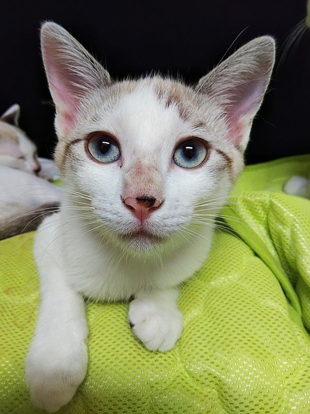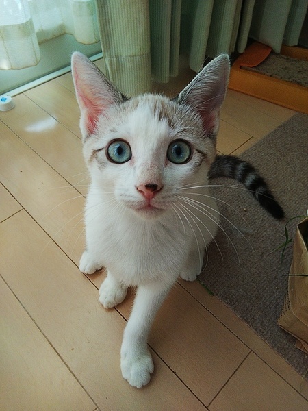 | 特徴(性格など) | シャム系トラ猫、メスの仔猫。 青く、少し緑の入ったキレイな目をしています。尻尾はシマシマで真っ直ぐです。鼻に黒い点があります。 FIV Felv共に陰性です。 |