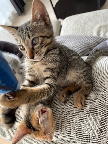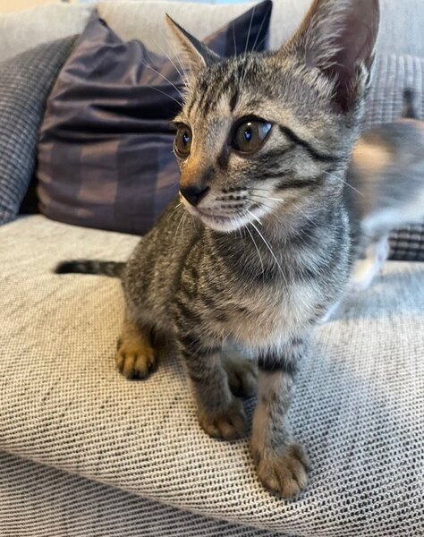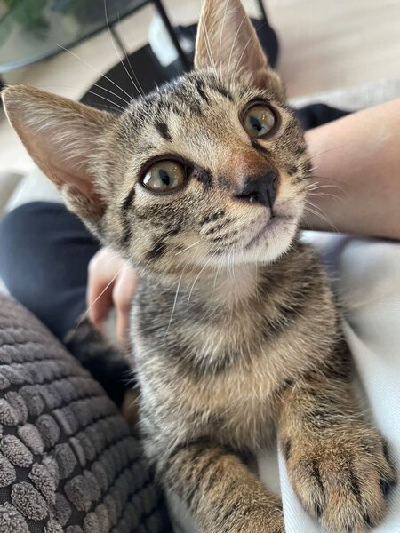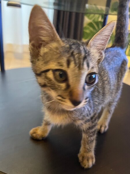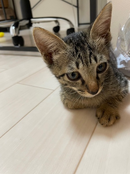 | 特徴(性格など) | 仮名・ジジ 【特徴】 キジトラ柄。 鼻はこげ茶。 目はゴールド系。 額にMの模様。 目尻にクレオパトララインがあります。 【性格】 食いしん坊で人懐っこく、落ち着いた性格です。 遊び上手で高いところが大好き。 ややおっとりさんです。 キキ、ミミと兄弟です。 |