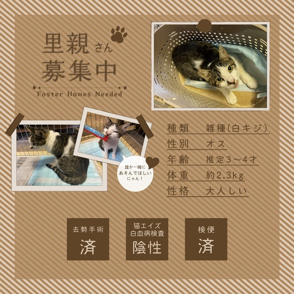 | 特徴(性格など) | 柄は白キジで、性格は大人しくて人馴れしています。 | ||