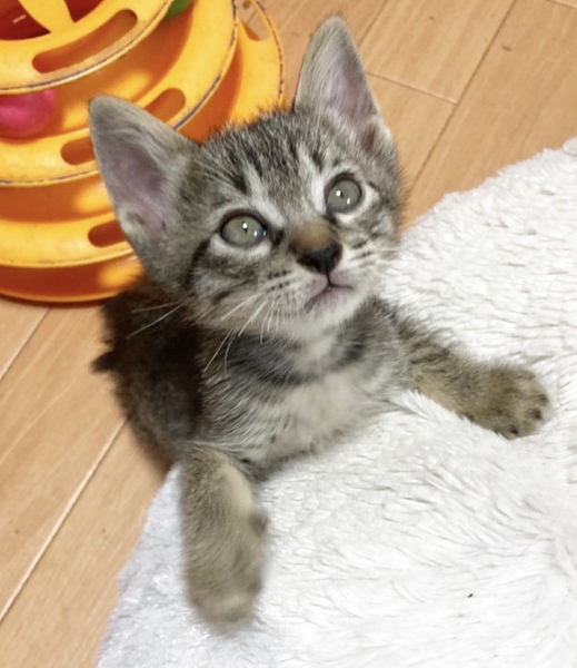 | 特徴(性格など) | *特徴 何柄かと聞かれるとキジトラに分類されるのですが、色味はサバトラさんに近く。また背中側はあまり縞模様になっていません。ちょっと変わった毛色です。 お顔や手足には縞、お腹は縞が切れてスポテッドっぽくなっています。お写真でご確認ください。 *性格 幼齢で6兄妹が皆一緒に保護されたせいか、警戒心が全く無く、兄妹達と仲良く過ごしています。 おもちゃが大好きでよく遊んでいる姿が見られます。おもちゃで遊んでいると誰かが参戦してきて一緒に遊ぶかケンカになるというのを飽きずに繰り返しています(笑) ちょうど今の時期から4ヶ月くらいまでの間は、子猫さんの社会性が育つ時期になります。取っ組み合いの喧嘩をしながら、甘噛みを覚えたり、追いかけっこしながら、動体視力を養っていきます。 出来れば、2頭一緒に迎えてくださるお宅か、一緒に遊べる先住猫さんのいるお宅の方を優先させていただきたいと考えております。 ご理解くださいますよう、よろしくお願いいたします。 |