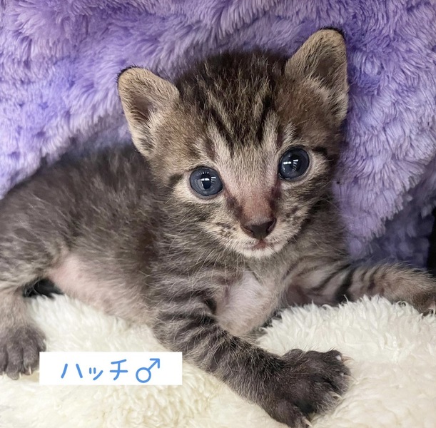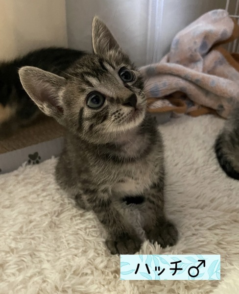 | 特徴(性格など) | 濃いめのきじ柄が素敵なハッチくん。つぶらな瞳にめろめろです。 まだ小さくて性格も分かりませんが、元気に育っています。 |