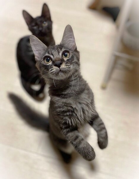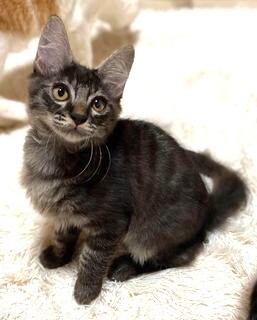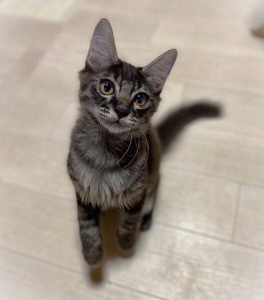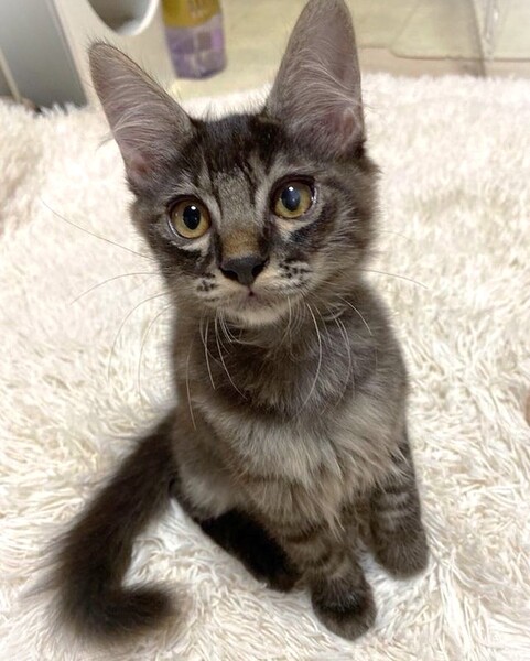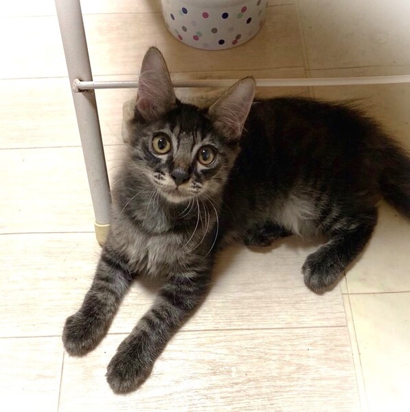 | 特徴(性格など) | 4月28日生まれ ふわふわ長い柔らかな被毛・お腹に白い差し色のしましま男の子 天真爛漫で人が大好き 撫でてゴロゴロ抱っこして更にゴロゴロの甘えん坊さん 色んなものに興味深々で、今はペットボトルのキャップ集めに熱中しています。 |