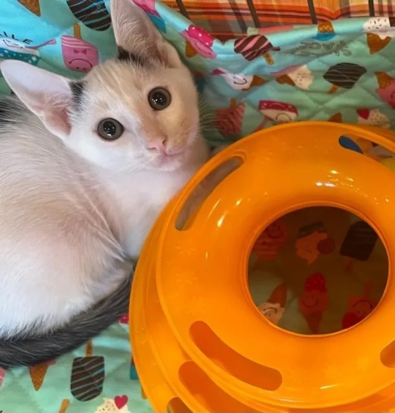 | 特徴(性格など) | ほとんど白地にきじがあちこちにあります。背中に2個○があるのでニコです。 よく食べよく遊ぶ、猫の模範のような子ですが、ちょっとシャイ。 そこがたまりませんね。 赤ちゃんの時から人の手で育てられましたので、めちゃくちゃなついています。 |