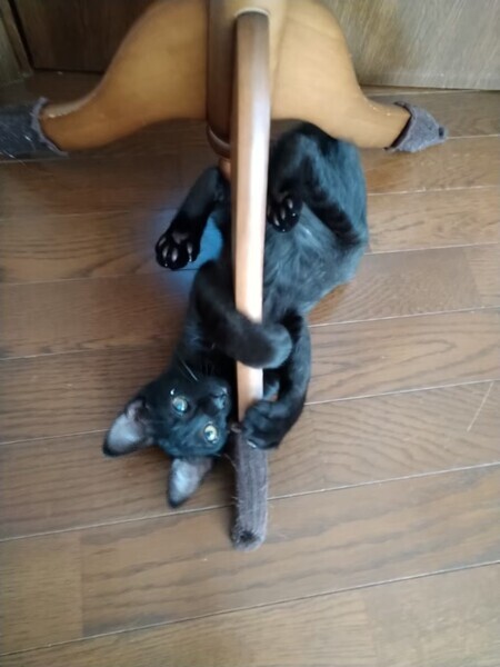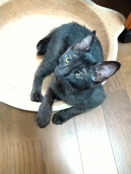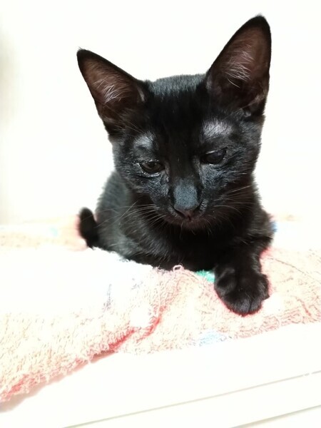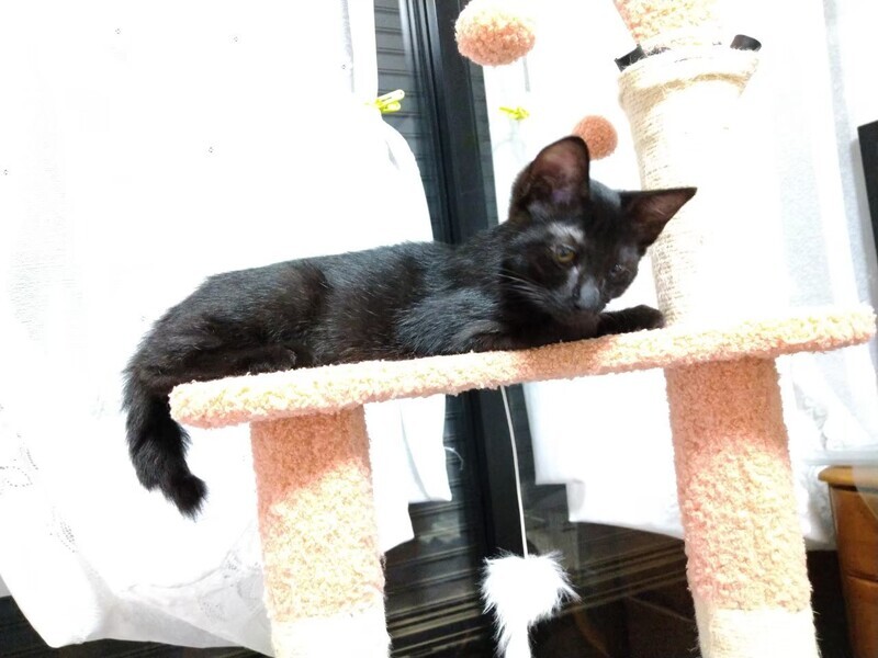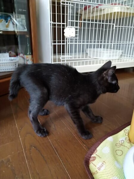 | 特徴(性格など) | 2022.5.17生まれ(推定) 毛色:黒 カクカク曲がったしっぽの黒猫の女のコ。 カラダ全体に少し白い毛が混じっています。 保護された時、目の状態が悪く瞳が少し白濁していますが、 ちゃんと見えているので普通に生活しています。 好奇心旺盛でお転婆さんです。 他の子猫とのニャンプロや小さいボールを転がして遊ぶのが大好きです。 人がしゃがんで猫のトイレを掃除していると、 足の間に入ってきてゴロゴロ甘えます。 |
